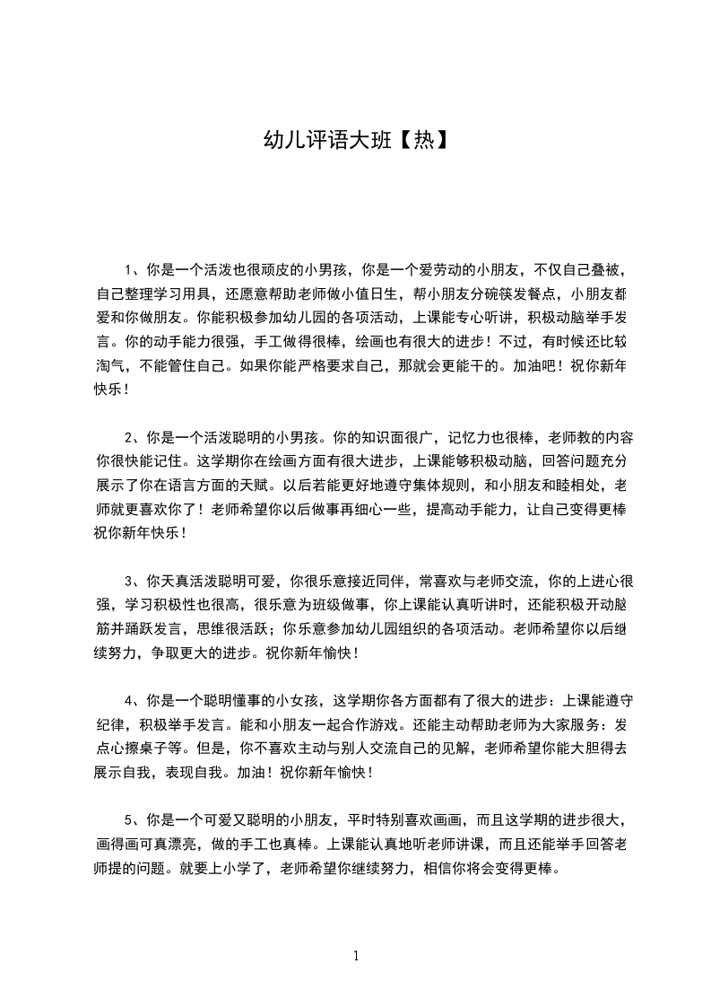 7.汪宇成:老师发现你其实是一个很能干的小男孩,喜欢帮助集体做自己力所能及的事,在老师的指导下也能正确地完成作业,只是你有时太调皮,中午睡觉是不睡却和小朋友讲话,这样好吗希望新的一年里,你能改掉这些缺点,做一个人人都喜欢的好孩子,老师相信你一定能做到!