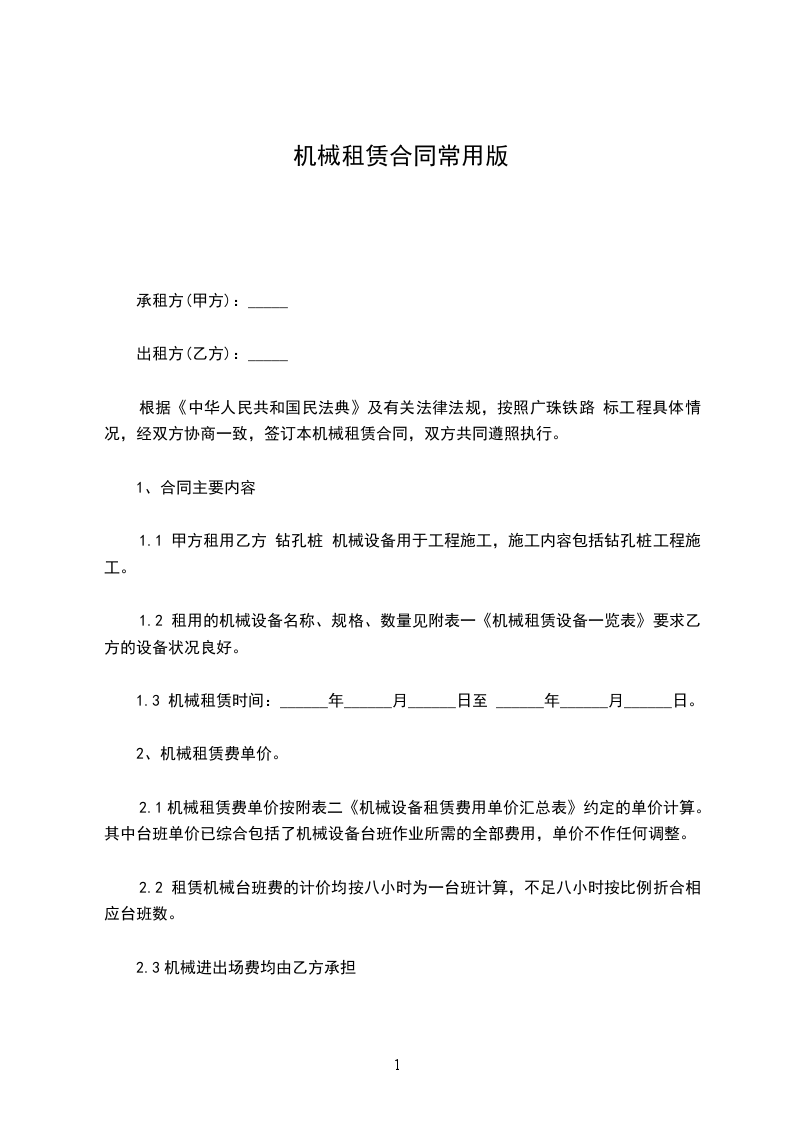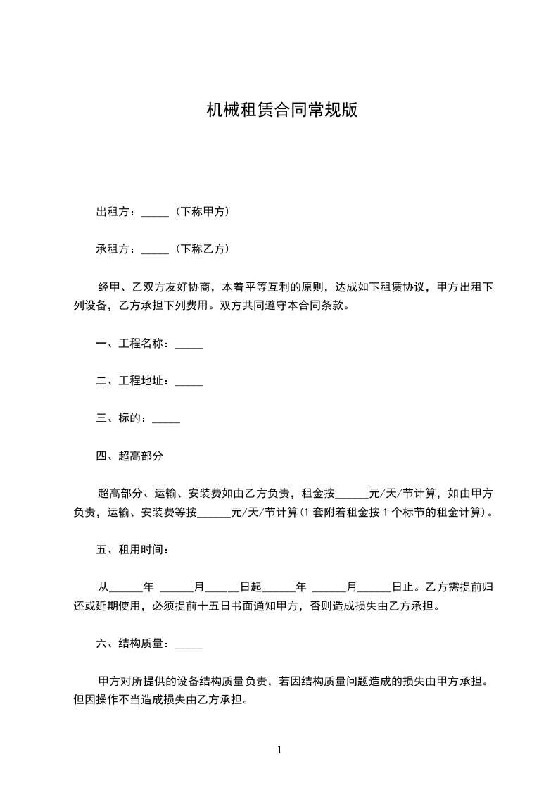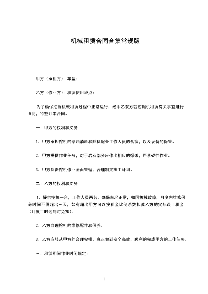 第一条:公司原则上对使用设备时间在一个月以下的不租赁。承租人凡低于一个月的租赁期,又急需使用的设备,租赁费按整月计算。