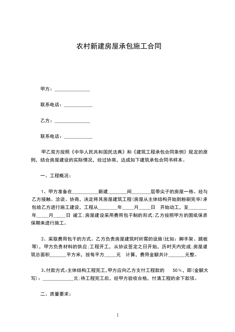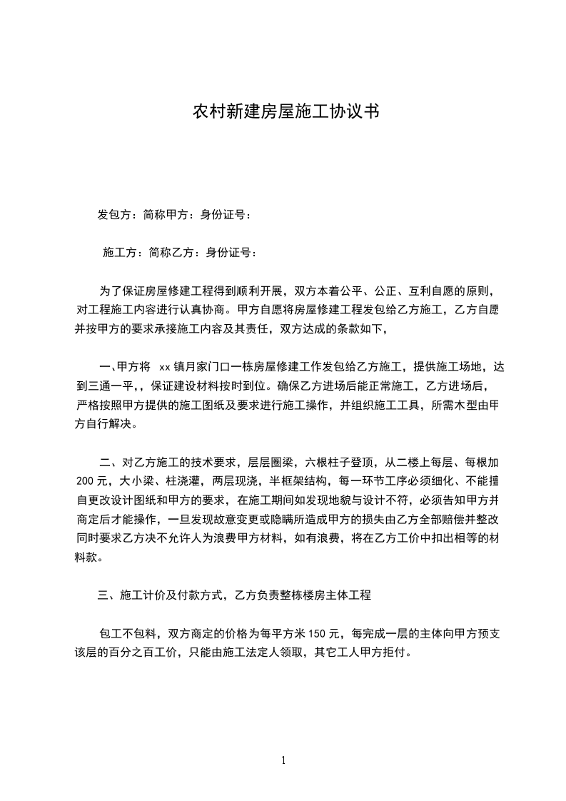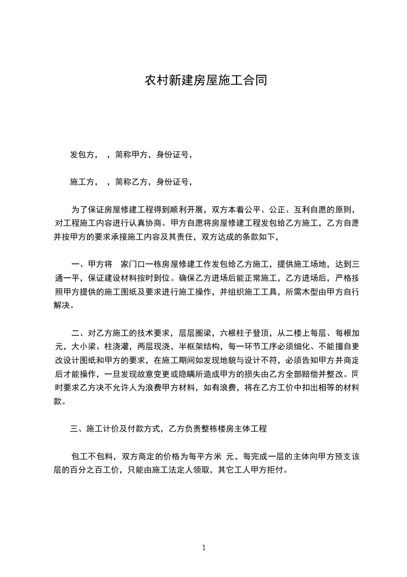 一、甲方将 家门口一栋房屋修建工作发包给乙方施工,提供施工场地,达到三通一平,保证建设材料按时到位。确保乙方进场后能正常施工,乙方进场后,严格按照甲方提供的施工图纸及要求进行施工操作,并组织施工工具,所需木型由甲方自行解决。