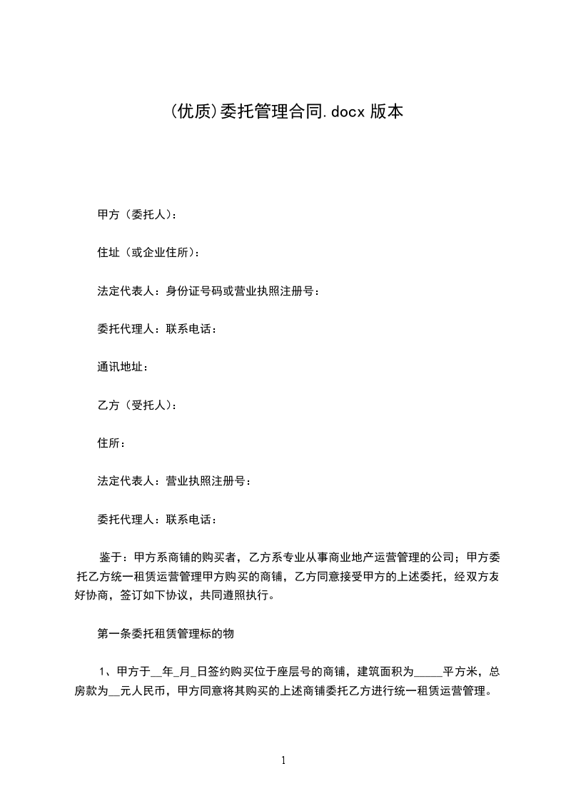 1、甲方于__年_月_日签约购买位于座层号的商铺,建筑面积为_____平方米,总房款为__元人民币,甲方同意将其购买的上述商铺委托乙方进行统一租赁运营管理。