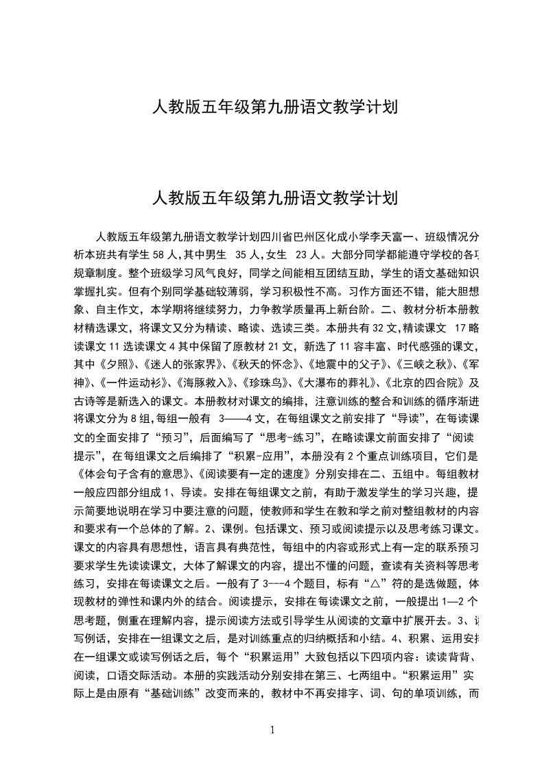 人教版五年级第九册语文教学计划四川省巴州区化成小学李天富一、班级情况分析本班共有学生58人,其中男生35人,女生23人。大部分同学都能遵守学校的各项规章制度。整个班级学习风气良好,同学之间能相互团结互助,学生的语文基础知识掌握扎实。但有个别同学基础较薄弱,学习积极性不高。习作方面还不错,能大胆想象、自主作文,本学期将继续努力,力争教学质量再上新台阶。二、教材分析本册教材精选课文,将课文又分为精读、略读、选读三类。本册共有32文,精读课文17略读课文11选读课文4其中保留了原教材21文,新选了11容丰富、时代感强的课文,其中《夕照》、《迷人的张家界》、《秋天的怀念》、《地震中的父子》、《三峡之秋》、《军神》、《一件运动衫》、《海豚救入》、《珍珠鸟》、《大瀑布的葬礼》、《北京的四合院》及古诗等是新选入的课文。本册教材对课文的编排,注意训练的整合和训练的循序渐进,将课文分为8组,每组一般有3——4文,在每组课文之前安排了“导读”,在每读课文的全面安排了“预习”,后面编写了“思考-练习”,在略读课文前面安排了“阅读提示”,在每组课文之后编排了“积累-应用”,本册没有2个重点训练项目,它们是《体会句子含有的意思》、《阅读要有一定的速度》分别安排在二、五组中。每组教材一般应四部分组成1、导读。安排在每组课文之前,有助于激发学生的学习兴趣,提示简要地说明在学习中要注意的问题,使教师和学生在教和学之前对整组教材的内容和要求有一个总体的了解。2、课例。包括课文、预习或阅读提示以及思考练习课文。课文的内容具有思想性,语言具有典范性,每组中的内容或形式上有一定的联系预习。要求学生先读读课文,大体了解课文的内容,提出不懂的问题,查读有关资料等思考.练习,安排在每读课文之后。一般有了3---4个题目,标有“△”符的是选做题,体现教材的弹性和课内外的结合。阅读提示,安排在每读课文之前,一般提出1—2个思考题,侧重在理解内容,提示阅读方法或引导学生从阅读的文章中扩展开去。3、读写例话,安排在一组课文之后,是对训练重点的归纳概括和小结。4、积累、运用安排在一组课文或读写例话之后,每个“积累运用”大致包括以下四项内容:读读背背、阅读,口语交际活动。本册的实践活动分别安排在第三、七两组中。“积累运用”实际上是由原有“基础训练”改变而来的,教材中不再安排字、词、句的单项训练,而是在整合的训练中,培养学生理解语言,积累语言和运用语言的能力。“积累运用”中安排的第一项“读读背背”侧重引导学生在了解中华优秀文化的同时,积累语言;第二项“阅读”,通过阅读成语故事或其他短文,丰富知识,开阔视野,增加文化底蕴,培养独立阅读能力;第三项“口语交际”,旨在交流互动中提高口语交际的能力:第四项“习作”,适当降低了作文教学的要求,减少了命题作文,增加了想象作文和写应用文的比重,以激发学生的想象力和创造力,提高应用文的作文能力;“实践活动”,引导学生进行综合性、研究性学习,培养学生的探究意识和语文综合能力。由导读到“积累应用”,体现了由实践到认识再到实践的过程,由上一组教材到下一组教材,体现了循环往复逐步提高的训练过程。三、教学目的要求1、能利用汉语拼音识字,学习普通话。2、培养独立识字的能力,学习230个生字,其中160个能读准子音,认清字形,了解在语言环境中的字义,并能正确书写,会认70个生字,只要求读准子音,不要求会写。3、能联系上下文,结合生活实际或查字典理解词语意思,特别是含义比较深刻的句子,学过的词语大部分能在口头或书面中运用,学过用词造句的方法,把对词句的理解、积累和运用的训练结合起来,使他们成为一个有机的整体。4、能用普通话正确、流利、有感情的朗读课文,能背诵指定的课文,默读要有一定的速度,在阅读课文的过程中,理解词语在语言环境中的恰当意义,辨别词语的感情色彩,联系上下文和自己的积累,领会有一定内涵的词句,体会其表达效果,在阅读中揣摩文章的表达顺序,体会作者的思想感情,初步领悟文章基本的表达方法,在交流和讨论中敢于提出自己的想法,作出自己的判断,能借助字典或有关资料独立阅读程度适合的读物,了解主要内容,学习浏览,能根据需要收集有关资料,逐步养成课外阅读的习惯,鼓励探究形阅读,本学期课外阅读不少于20万字。5、口语交际(1)、能用普通话清楚明白地讲述一件事情,讨论问题能讲清自己的意思。(2)、与人交流能尊重理解对方可,乐于参与讨论,敢于发表自己的意见。(3)、听他人说话认真耐心,并能简要转述,说话要有礼貌。6、写作能抓住重点观察事物,养成勤于观察思考和乐于动笔的习惯,珍视个人的独特感受积累习作素材,能在观察的基础上写出内容比较具体,有一定条理、有真情实感的简单的记实作文和想象作文,学写读后感和缩写课文,练习从内容、词句、标点等方面修改自己习作,并主动与他人交换修改,40分钟能完成不少于400字作文。7、实践活动(1)、对自己身边的、大家共同关注的问题,学习是非善恶。(2)、初步了解查找资料、运用资料的基本方法。(3)、策划简单的社会活动,对策划的主题进行讨论和分析,学习活动计划和活动总结。8、写字(1)、硬笔书写楷书、行款整齐,有