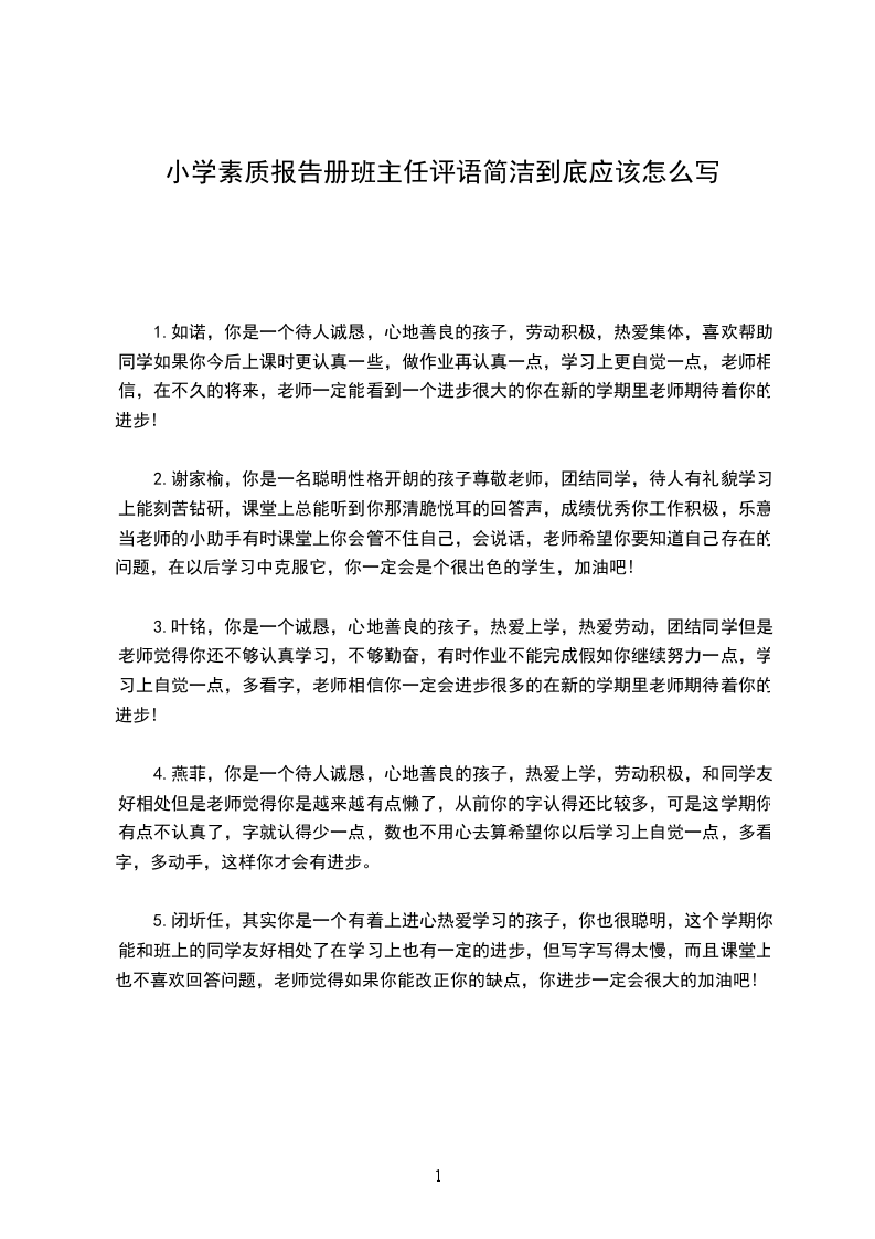1.如诺,你是一个待人诚恳,心地善良的孩子,劳动积极,热爱集体,喜欢帮助同学如果你今后上课时更认真一些,做作业再认真一点,学习上更自觉一点,老师相信,在不久的将来,老师一定能看到一个进步很大的你在新的学期里老师期待着你的进步!