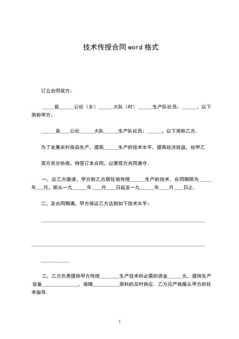 一,应乙方邀请,甲方到乙方居住地传授______生产的技术.合同期限为_____年___月,即从一九______年____月____日起至一九______年____月____日止.