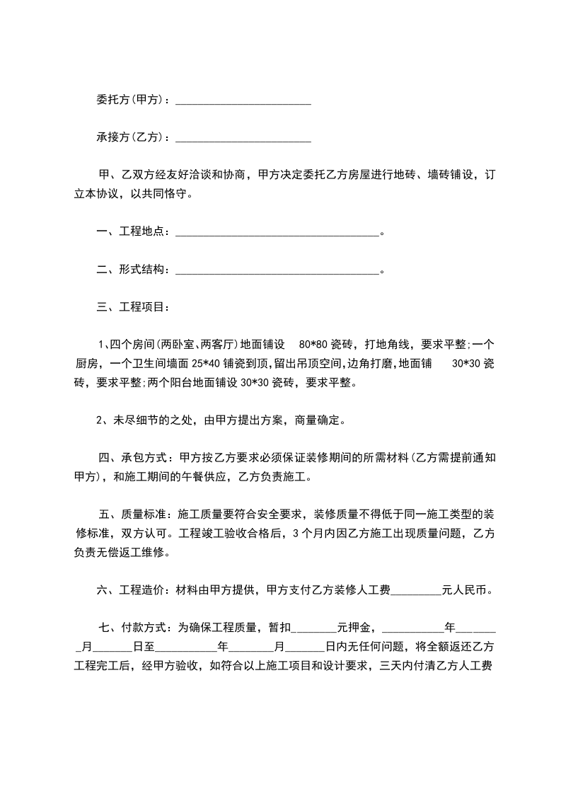 甲、乙双方经友好洽谈和协商,甲方决定委托乙方房屋进行地砖、墙砖铺设,订立本协议,以共同恪守。