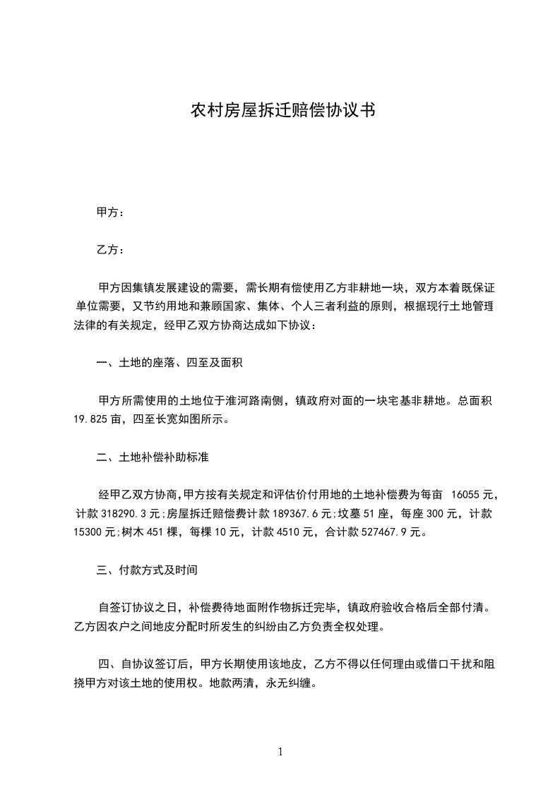 经甲乙双方协商,甲方按有关规定和评估价付用地的土地补偿费为每亩16055元,计款318290.3元;房屋拆迁赔偿费计款189367.6元;坟墓51座,每座300元,计款15300元;树木451棵,每棵10元,计款4510元,合计款527467.9元。