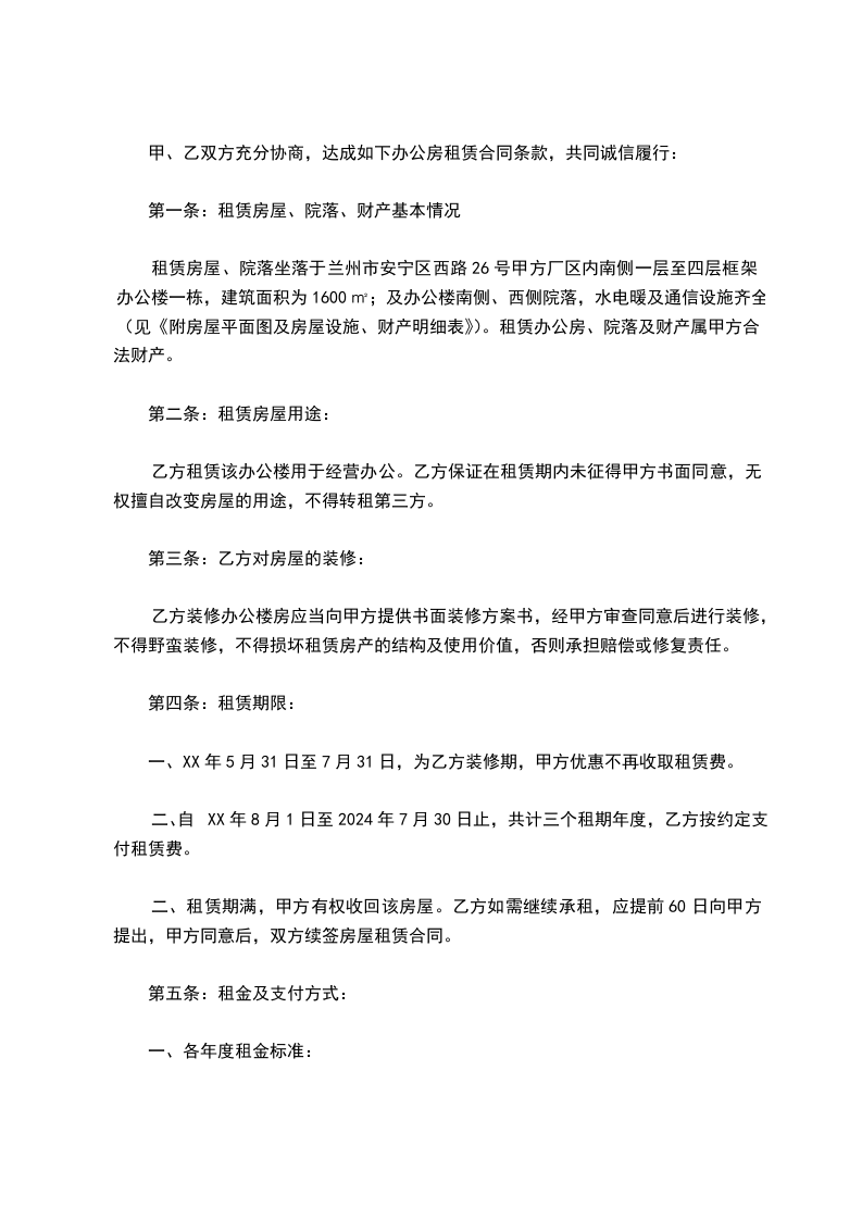 租赁房屋、院落坐落于兰州市安宁区西路26号甲方厂区内南侧一层至四层框架办公楼一栋,建筑面积为1600㎡;及办公楼南侧、西侧院落,水电暖及通信设施齐全(见《附房屋平面图及房屋设施、财产明细表》)。租赁办公房、院落及财产属甲方合法财产。
