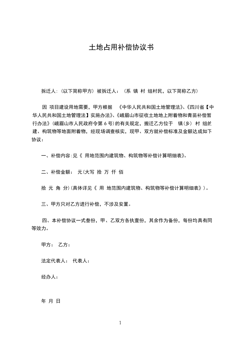 因 项目建设用地需要,甲方根据 《中华人民共和国土地管理法》、《四川省【中华人民共和国土地管理法】实施办法》、《峨眉山市征收土地地上附着物和青苗补偿暂行办法》(峨眉山市人民政府令第6号)的有关规定,搬迁乙方位于 镇(乡) 村 组的建、构筑物等地面附着物,经现场调查核实,现甲、双方就补偿标准及金额达成如下协议: