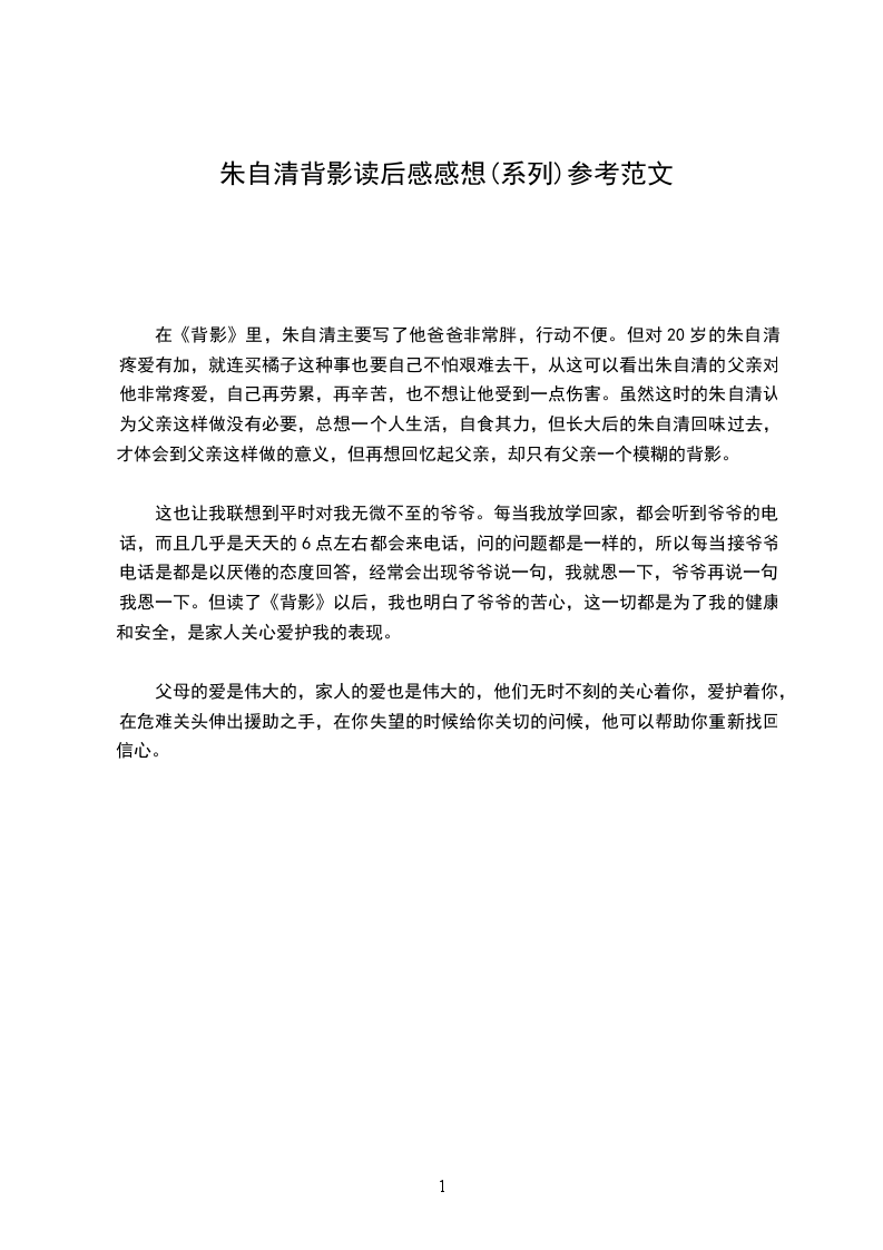 这也让我联想到平时对我无微不至的爷爷。每当我放学回家,都会听到爷爷的电话,而且几乎是天天的6点左右都会来电话,问的问题都是一样的,所以每当接爷爷电话是都是以厌倦的态度回答,经常会出现爷爷说一句,我就恩一下,爷爷再说一句,我恩一下。但读了《背影》以后,我也明白了爷爷的苦心,这一切都是为了我的健康和安全,是家人关心爱护我的表现。