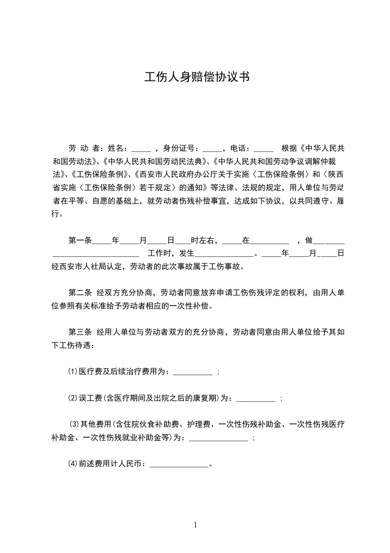 劳 动 者:姓名:_____ ,身份证号:_____,电话:_____ 根据《中华人民共和国劳动法》、《中华人民共和国劳动民法典》、《中华人民共和国劳动争议调解仲裁法》、《工伤保险条例》、《西安市人民政府办公厅关于实施〈工伤保险条例〉和〈陕西省实施〈工伤保险条例〉若干规定〉的通知》等法律、法规的规定,用人单位与劳动者在平等、自愿的基础上,就劳动者伤残补偿事宜,达成如下协议,以共同遵守、履行。
