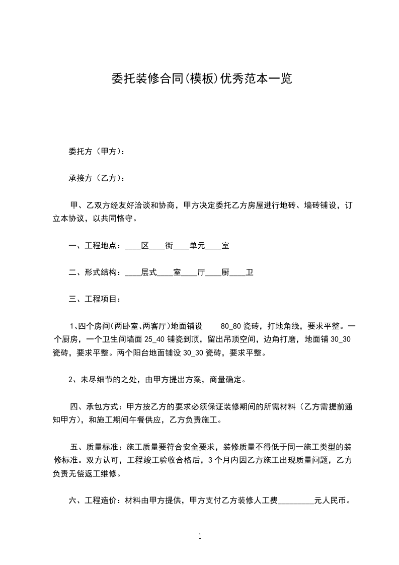 六、工程造价:材料由甲方提供,甲方支付乙方装修人工费_________元人民币。