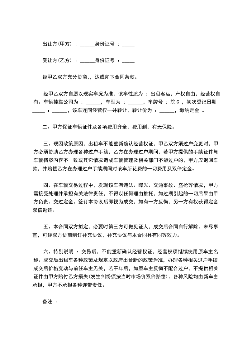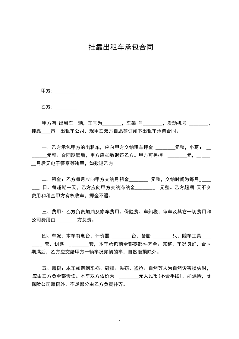 1、甲方将 轿车一辆租赁给乙方,车牌号为 ,发动机号为 ,租赁期限为 年,自 年 月 日至 年 月 日。