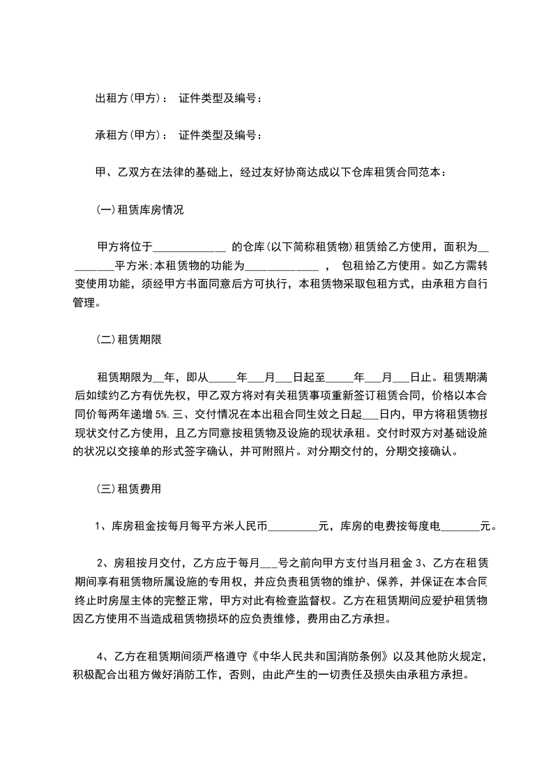 甲、乙双方在法律的基础上,经过友好协商达成以下仓库租赁合同范本: