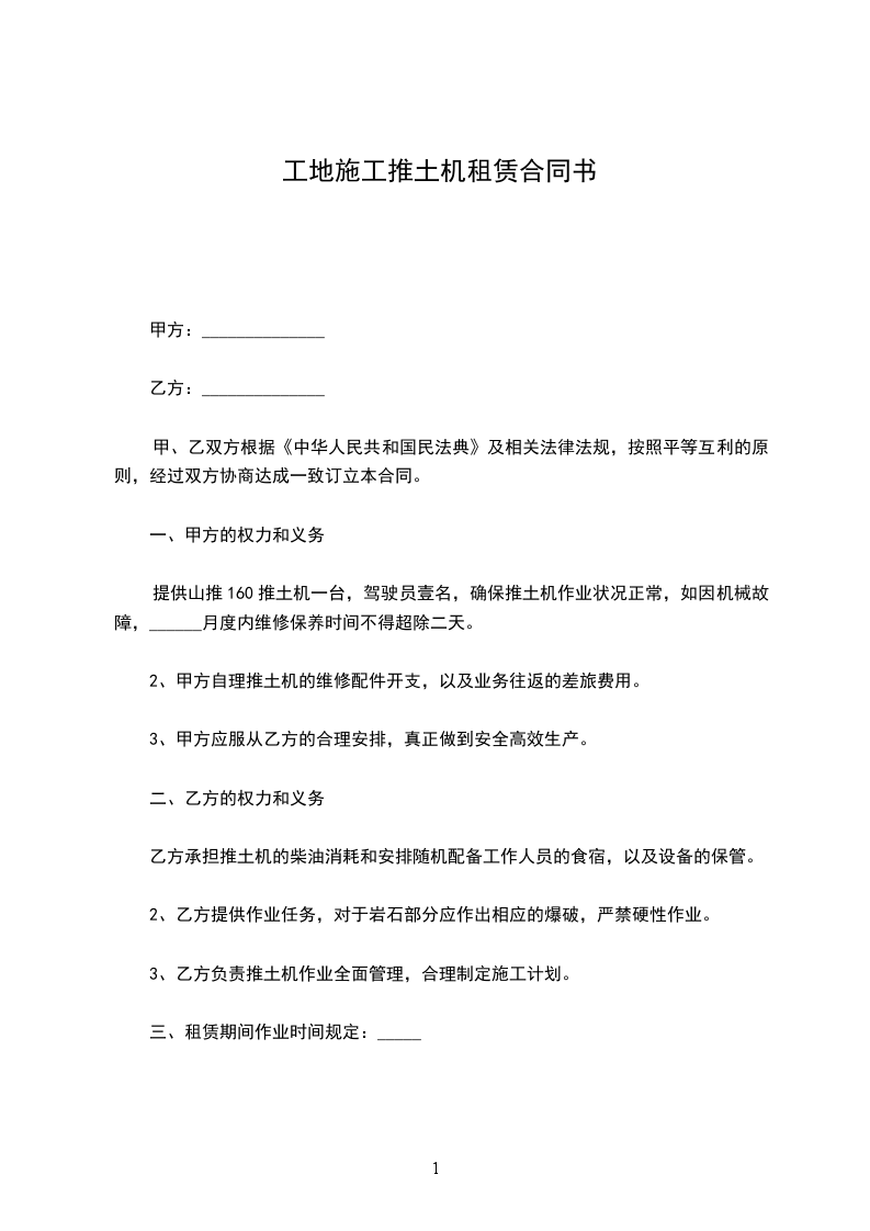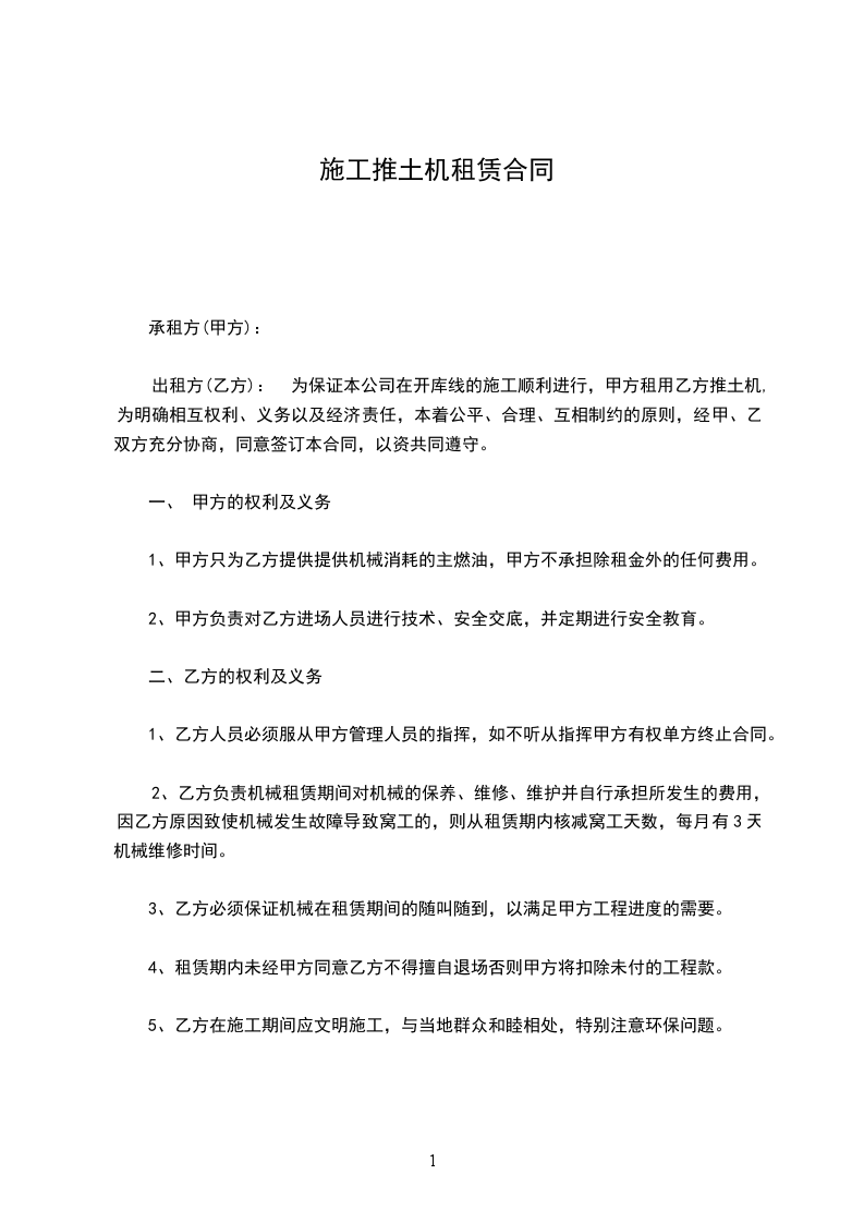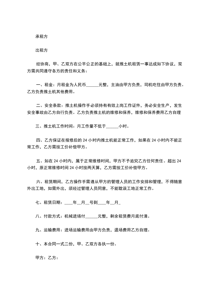 出租方(乙方): 为保证本公司在开库线的施工顺利进行,甲方租用乙方推土机,为明确相互权利、义务以及经济责任,本着公平、合理、互相制约的原则,经甲、乙双方充分协商,同意签订本合同,以资共同遵守。