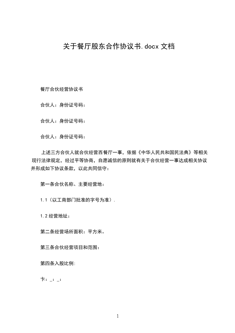 餐厅合伙经营协议书
