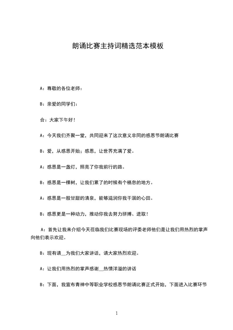 B:下面,我宣布青神中等职业学校感恩节朗诵比赛正式开始,下面进入比赛环节