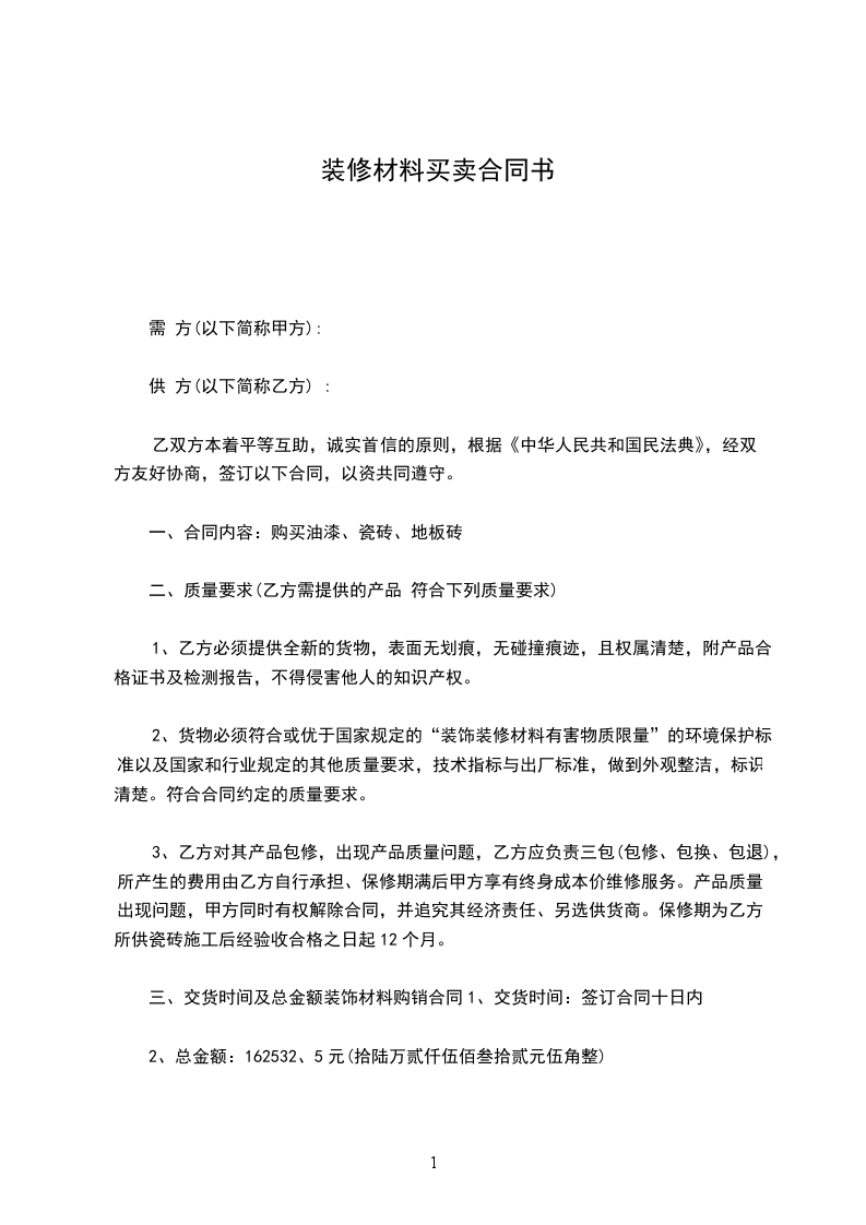一、合同内容:购买油漆、瓷砖、地板砖