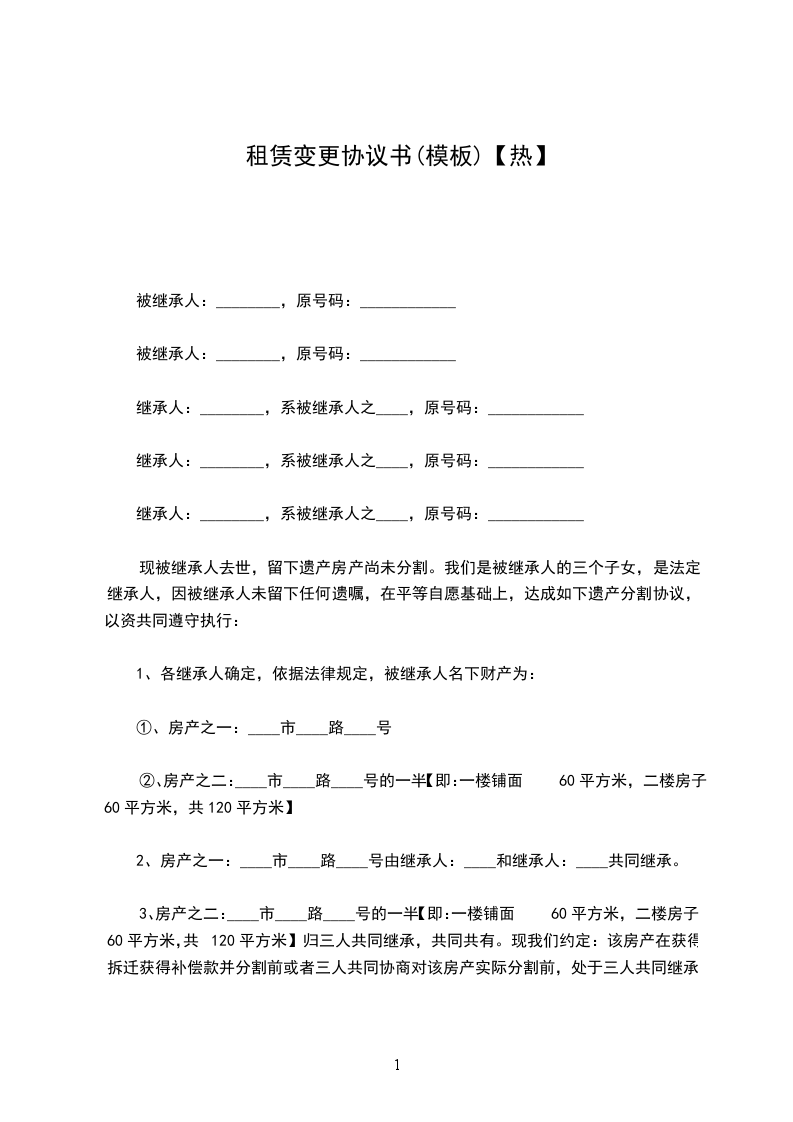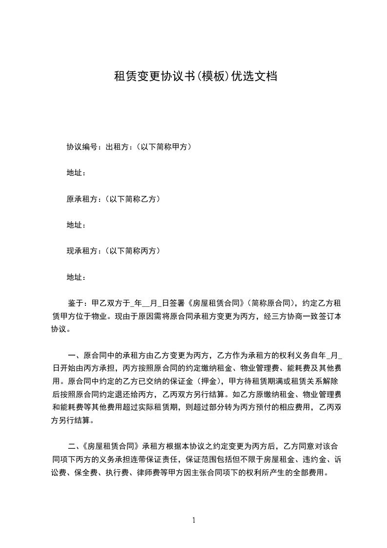 鉴于:甲乙双方于_年__月_日签署《房屋租赁合同》(简称原合同),约定乙方租赁甲方位于物业。现由于原因需将原合同承租方变更为丙方,经三方协商一致签订本协议。