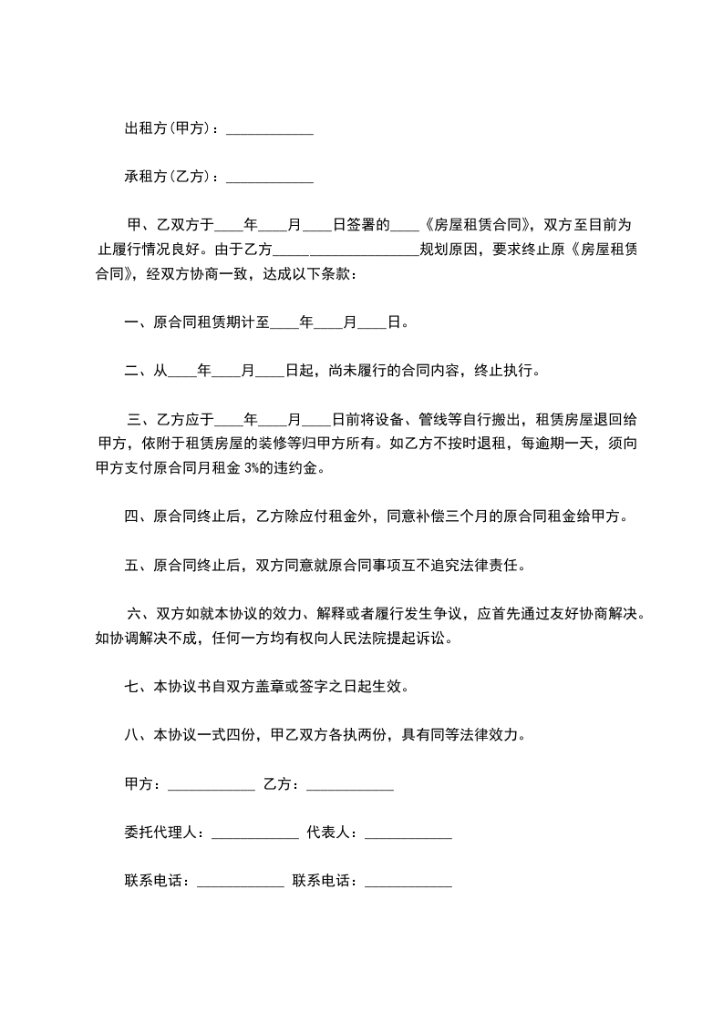 甲、乙双方于____年____月____日签署的____《房屋租赁合同》,双方至目前为止履行情况良好。由于乙方____________________规划原因,要求终止原《房屋租赁合同》,经双方协商一致,达成以下条款: