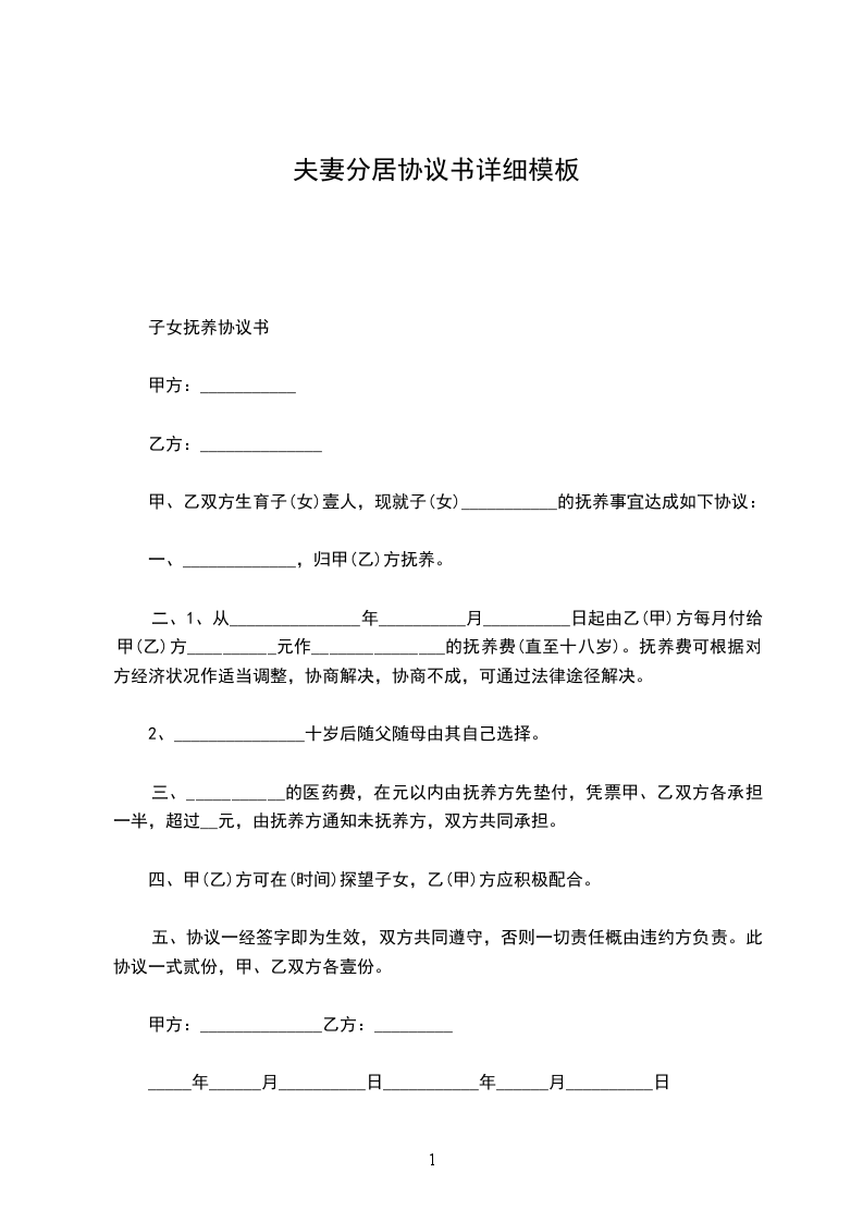 协议内容:由于协议人双方感情不和,暂时无和好肯可能,现经商议双方同意分居。分居期间,住处各自解决,互不履行经济扶助义务及夫妻生活义务,分居期间所得财产归各自所有,债务各自承担。分居期间,不抚养孩子一方每月向对方支付生活费__元,分居起始日期为__年__月__日。