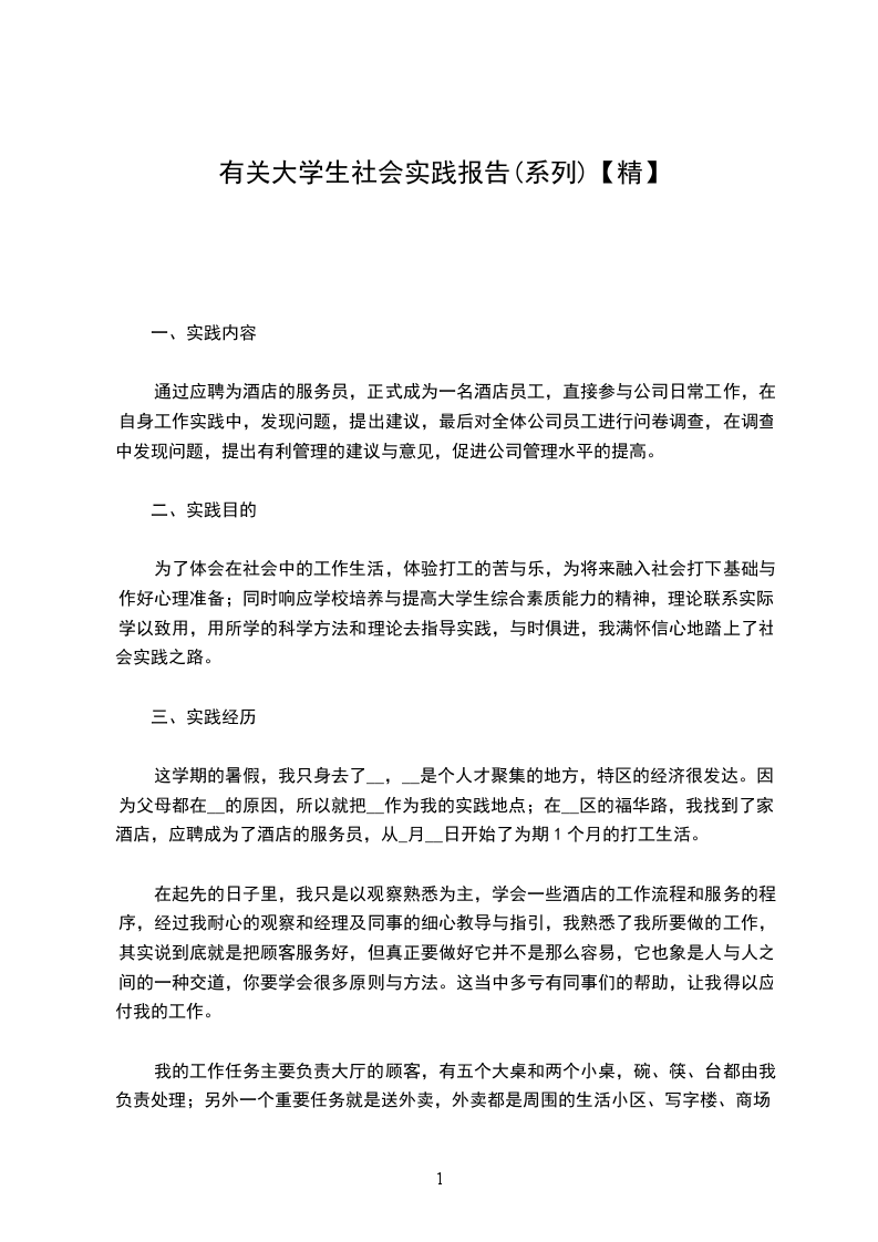这学期的暑假,我只身去了__,__是个人才聚集的地方,特区的经济很发达。因为父母都在__的原因,所以就把__作为我的实践地点;在__区的福华路,我找到了家酒店,应聘成为了酒店的服务员,从_月__日开始了为期1个月的打工生活。