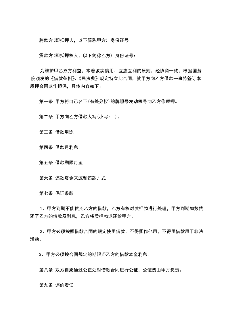 第一条 甲方将自己名下(有处分权)的牌照号发动机号向乙方作质押。