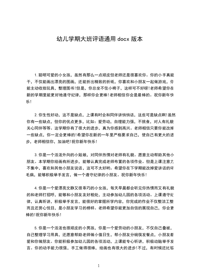 5.你是一个活泼也很顽皮的小男孩,你是一个爱劳动的小朋友,不仅自己叠被,自己整理学习用具,还愿意帮助老师做小值日生,帮小朋友分碗筷发餐点,小朋友都爱和你做朋友。你能积极参加幼儿园的各项活动,上课能专心听讲,积极动脑举手发言。你的动手能力很强,手工做得很棒,绘画也有很大的进步!不过,有时候还比较淘气,不能管住自己。如果你能严格要求自己,那就会更能干的。加油吧!祝你新年快乐!
