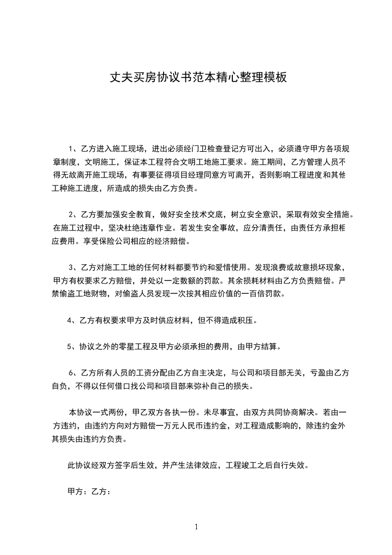 本协议一式两份,甲乙双方各执一份。未尽事宜,由双方共同协商解决。若由一方违约,由违约方向对方赔偿一万元人民币违约金,对工程造成影响的,除违约金外,其损失由违约方负责。