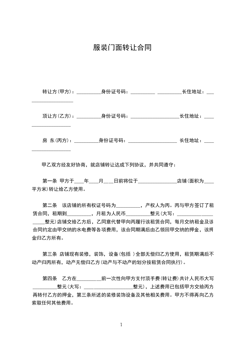 第一条 甲方于____年____月____日前将位于________________店铺(面积为____平方米)转让给乙方使用。