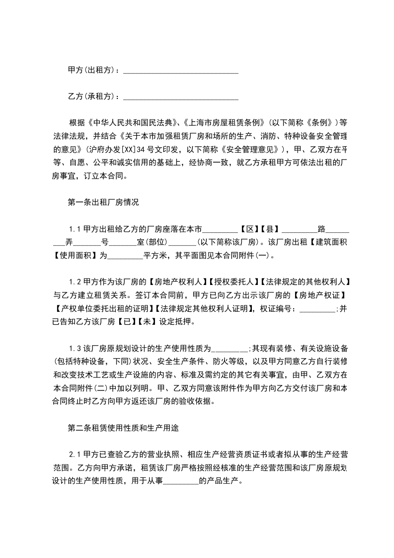 根据《中华人民共和国民法典》、《上海市房屋租赁条例》(以下简称《条例》)等法律法规,并结合《关于本市加强租赁厂房和场所的生产、消防、特种设备安全管理的意见》(沪府办发[XX]34号文印发,以下简称《安全管理意见》),甲、乙双方在平等、自愿、公平和诚实信用的基础上,经协商一致,就乙方承租甲方可依法出租的厂房事宜,订立本合同。
