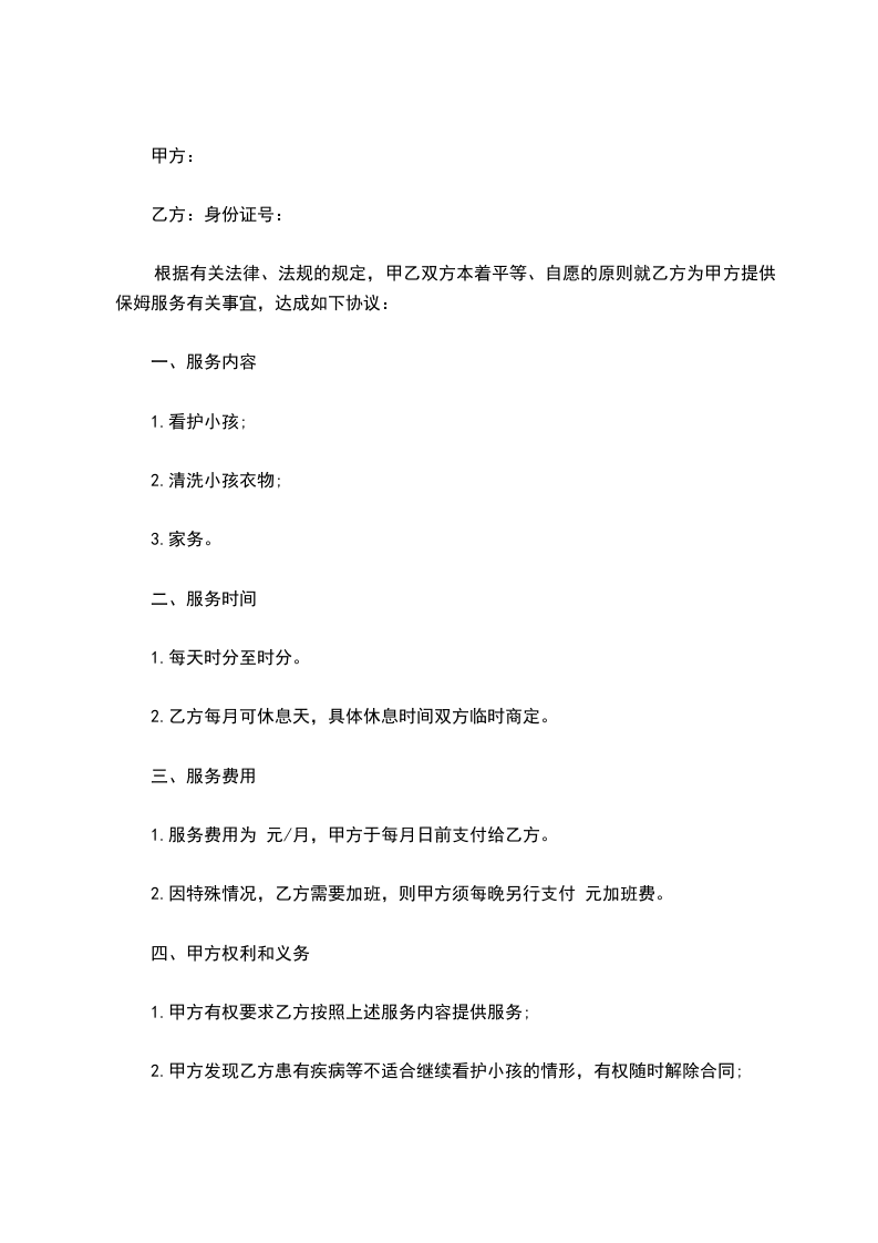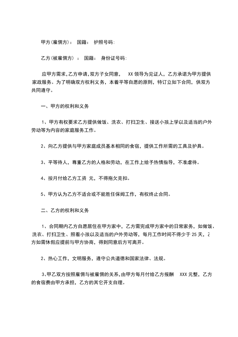 1、合同期内乙方自愿居住在甲方家中,乙方需完成甲方家中的日常家务,如做饭、洗衣、打扫卫生、照看小孩以及适当的户外劳动等,每月工作时间不得少于25天,乙方如需休假应提前与甲方协商,得到同意后方可离开。