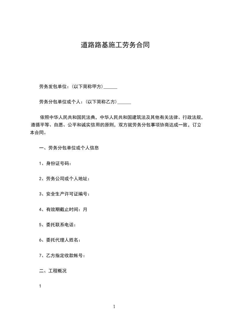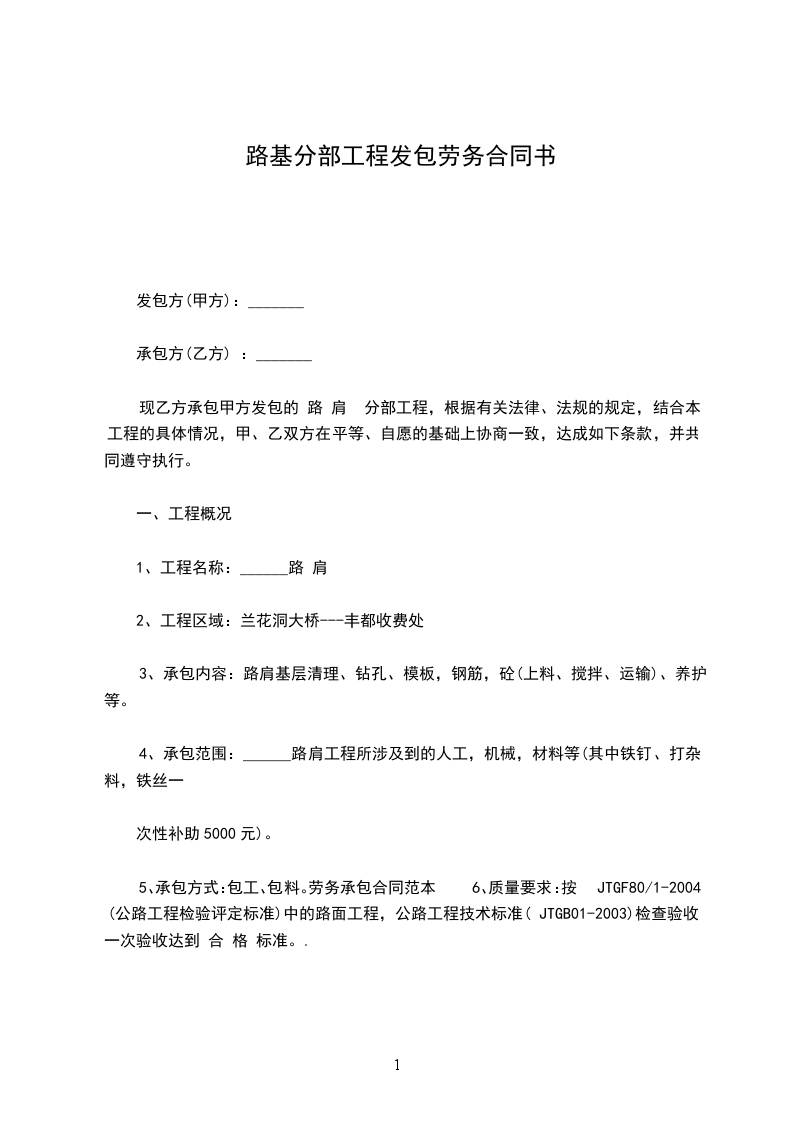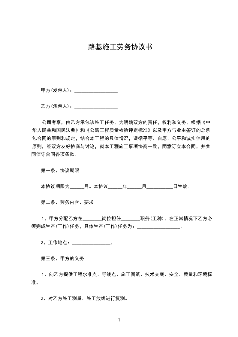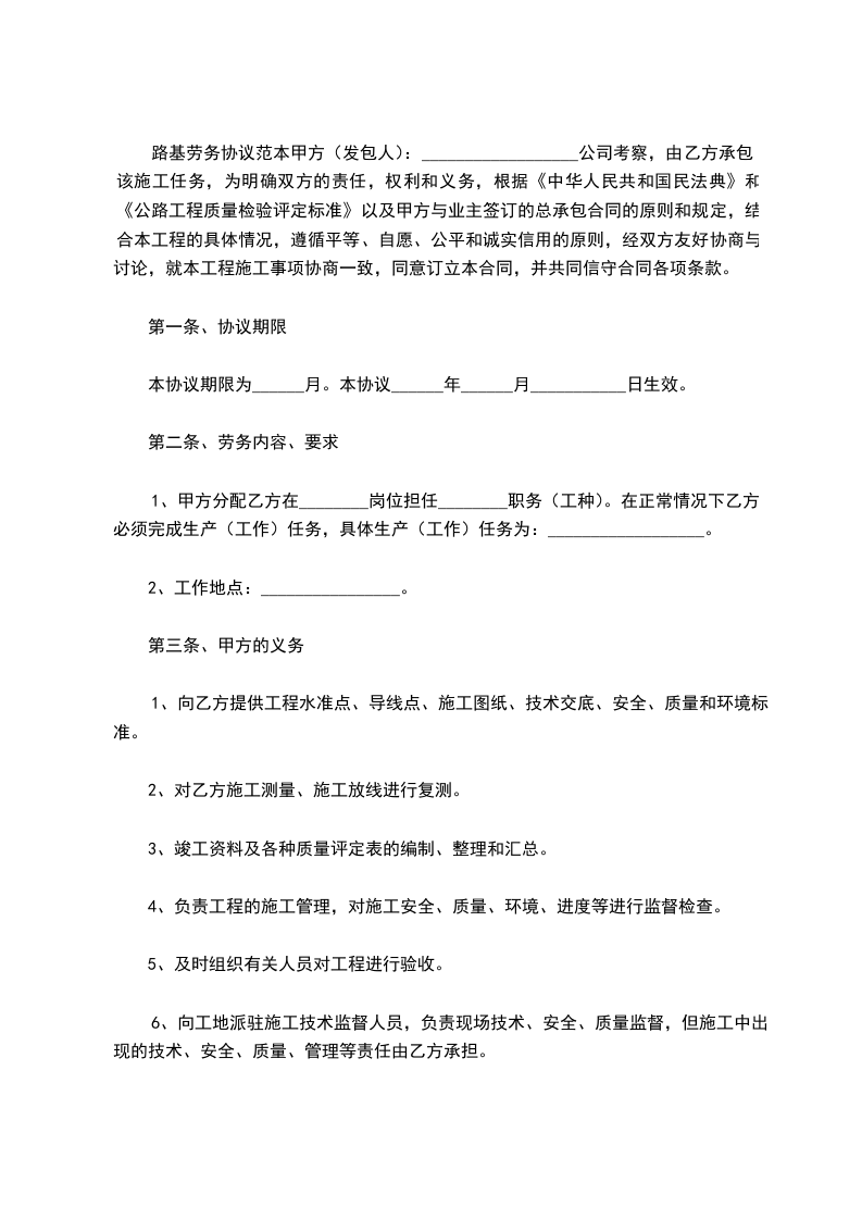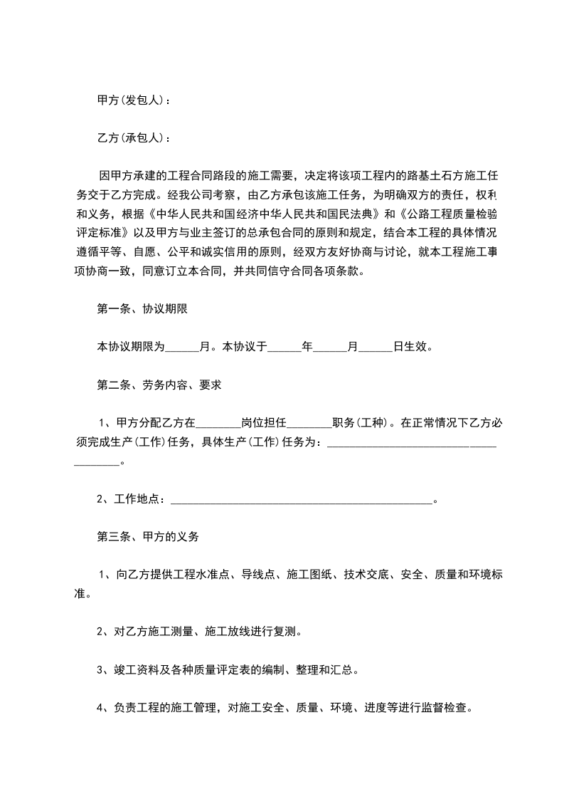 因甲方承建的工程合同路段的施工需要,决定将该项工程内的路基土石方施工任务交于乙方完成。经我公司考察,由乙方承包该施工任务,为明确双方的责任,权利和义务,根据《中华人民共和国经济中华人民共和国民法典》和《公路工程质量检验评定标准》以及甲方与业主签订的总承包合同的原则和规定,结合本工程的具体情况,遵循平等、自愿、公平和诚实信用的原则,经双方友好协商与讨论,就本工程施工事项协商一致,同意订立本合同,并共同信守合同各项条款。