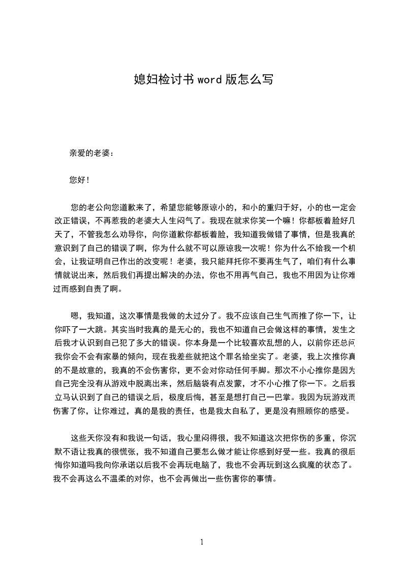 嗯,我知道,这次事情是我做的太过分了。我不应该自己生气而推了你一下,让你吓了一大跳。其实当时我真的是无心的,我也不知道自己会做这样的事情,发生之后我才认识到自己犯了多大的错误。你本身是一个比较喜欢乱想的人,以前你还总问我你会不会有家暴的倾向,现在我差些就把这个罪名给坐实了。老婆,我上次推你真的不是故意的,我真的不会伤害你,更不会对你动任何手脚。那次不小心推你是因为自己完全没有从游戏中脱离出来,然后脑袋有点发蒙,才不小心推了你一下。之后我立马认识到了自己的错误之后,极度后悔,甚至是想打自己一巴掌。我因为玩游戏而伤害了你,让你难过,真的是我的责任,也是我太自私了,更是没有照顾你的感受。