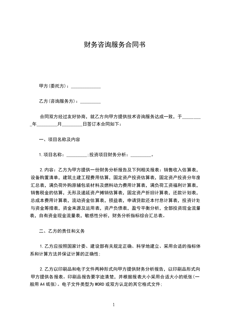 2.内容:乙方为甲方提供一份财务分析报告及下列相关报表:销售收入估算表,设备购置清单,建筑土建工程费用估算,固定资产投资估算表,固定资产投资分年度汇总表,满负荷外购原辅包装材料及燃料动力费用计算表,满负荷工资福利计算表,销售税金的估算,无形及递延资产摊销估算表,固定资产折旧计算表,还款计划表,总成本费用计算表,流动资金估算表,损益表,申请贷款还本付息计算表,投资计划与资金筹措表,资金来源及运用表,资产负债表,盈亏平衡分析,全部投资现金流量表,自有资金现金流量表,敏感性分析,财务分析指标综合汇总表。