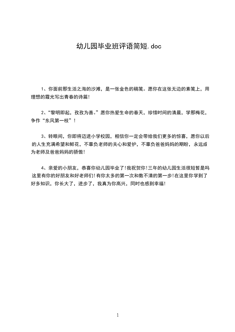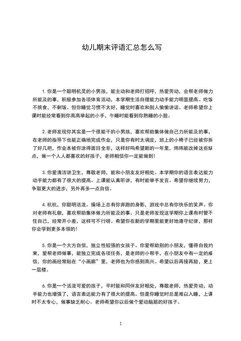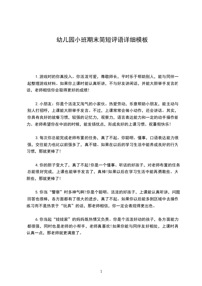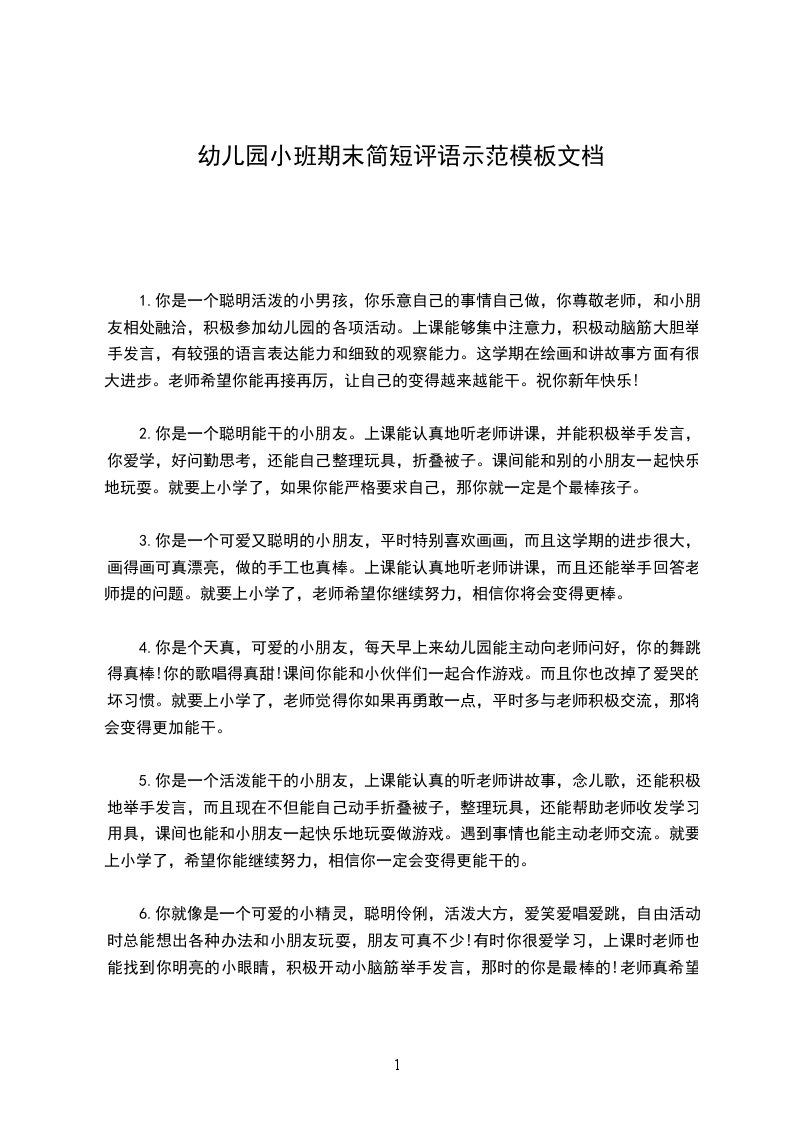 10)你是个聪明的孩子,游戏时你全身心地投入,朗诵儿歌时,大家都为你鼓掌,愿你升入中班后,有更棒的表现。
