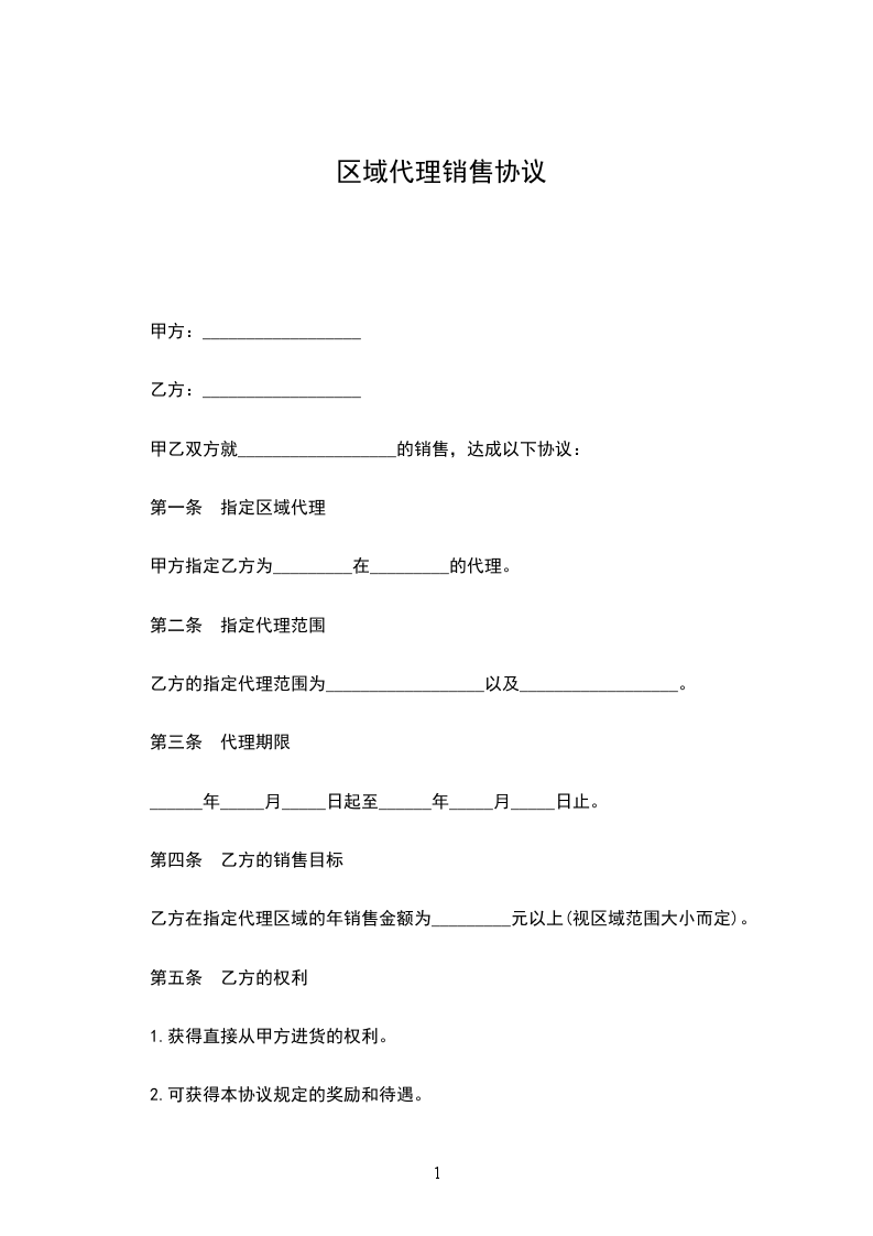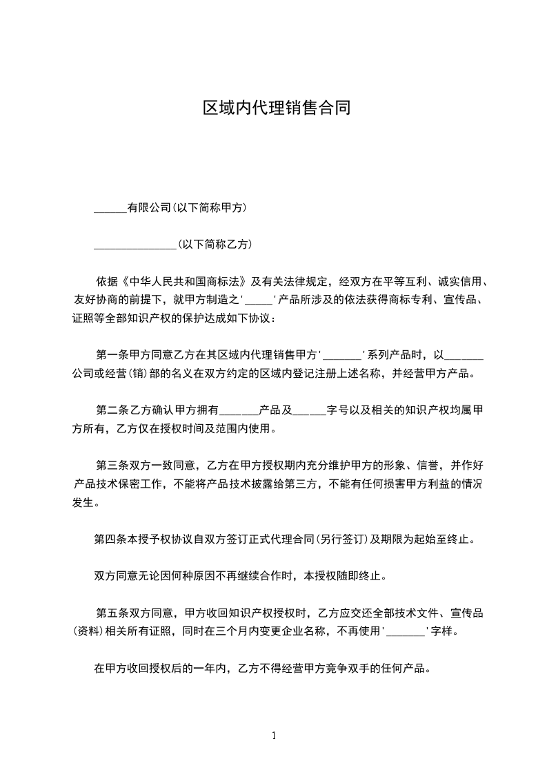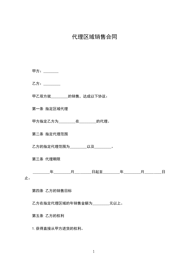 (1) 甲方授予乙方( __________________________________)区域的销售总代理权,由其全权负责该地区的销售和售后服务。 (2) 乙方接受甲方授权后,甲方不得在乙方总代理的区域内另设其它代理商或经销商。