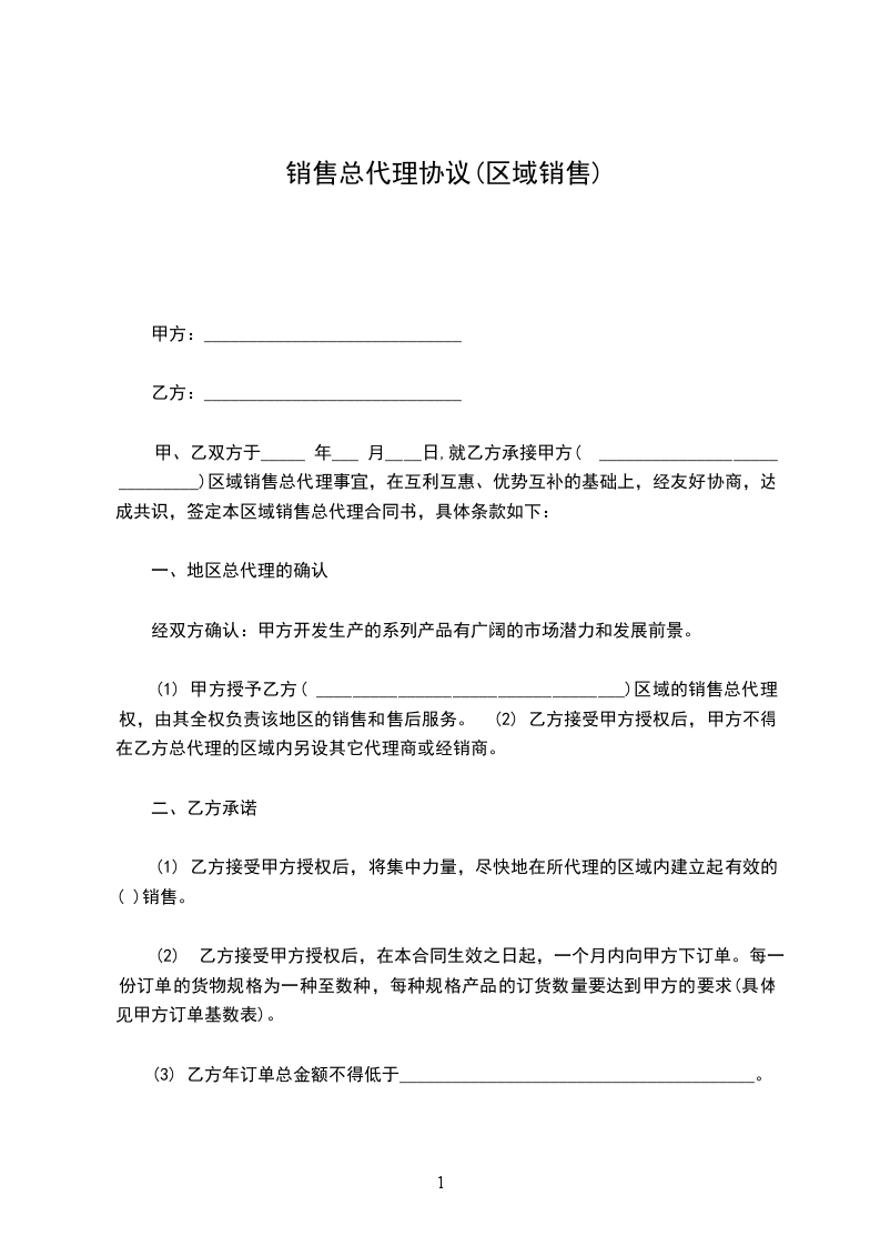 甲、乙双方于_____ 年___ 月____日,就乙方承接甲方( _____________________________)区域销售总代理事宜,在互利互惠、优势互补的基础上,经友好协商,达成共识,签定本区域销售总代理合同书,具体条款如下: