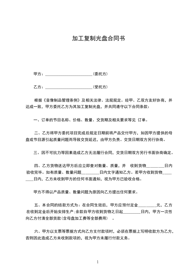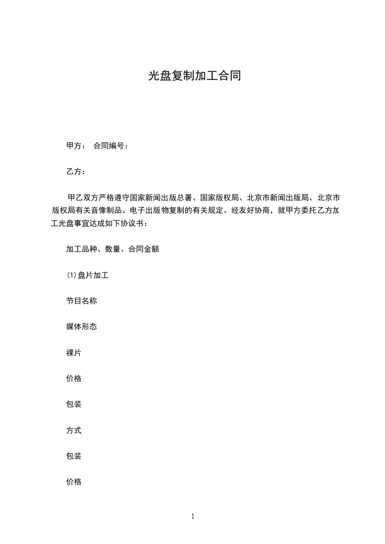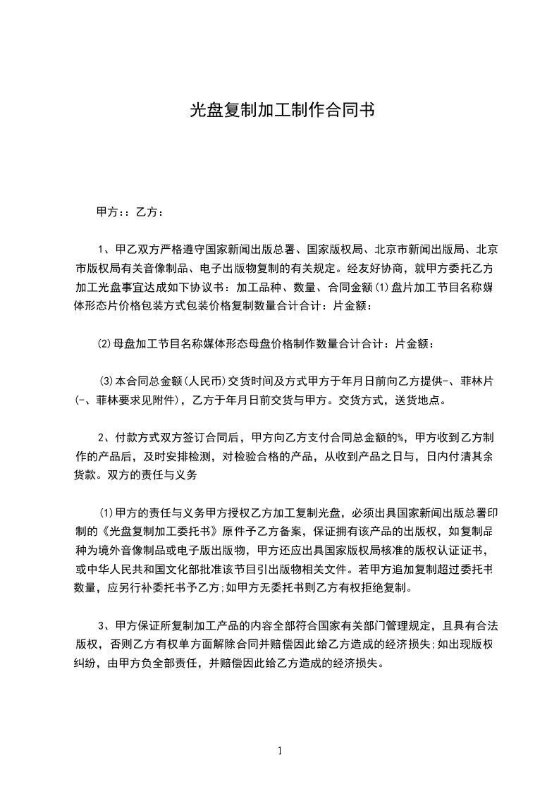 甲乙双方严格遵守国家新闻出版总署、国家版权局、北京市新闻出版局、北京市版权局有关音像制品、电子出版物复制的有关规定。经友好协商,就甲方委托乙方加工光盘事宜达成如下协议书: