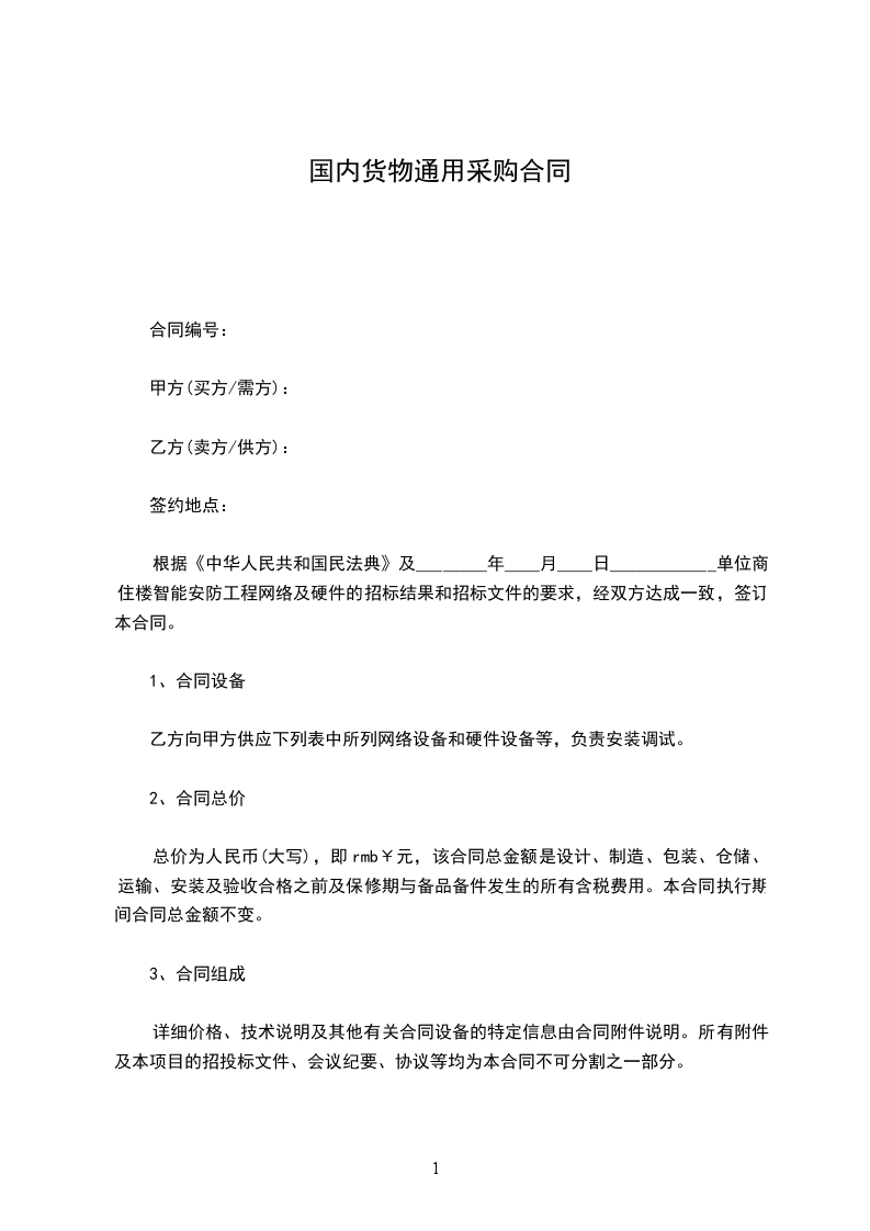 根据《中华人民共和国民法典》及________年____月____日____________单位商住楼智能安防工程网络及硬件的招标结果和招标文件的要求,经双方达成一致,签订本合同。