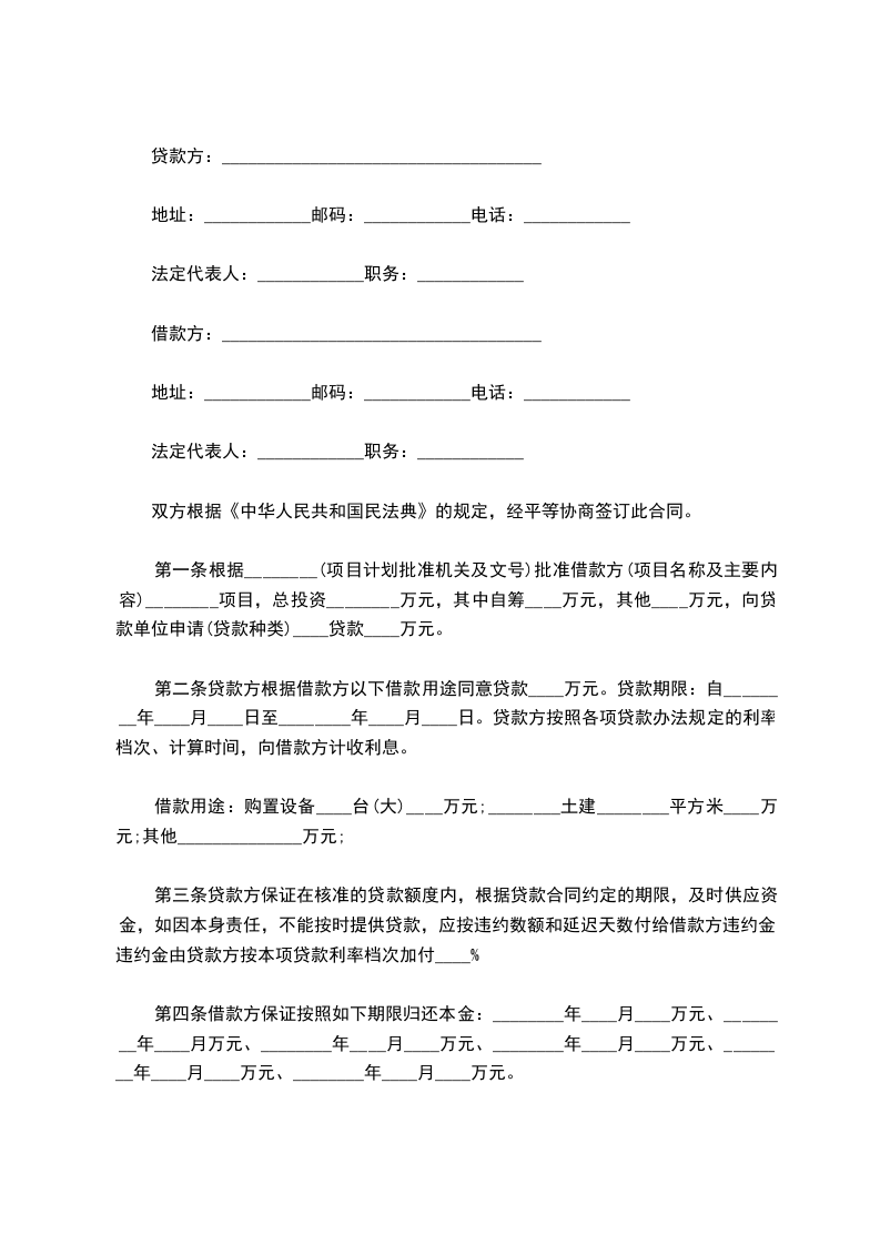 第一条根据________(项目计划批准机关及文号)批准借款方(项目名称及主要内容)________项目,总投资________万元,其中自筹____万元,其他____万元,向贷款单位申请(贷款种类)____贷款____万元。