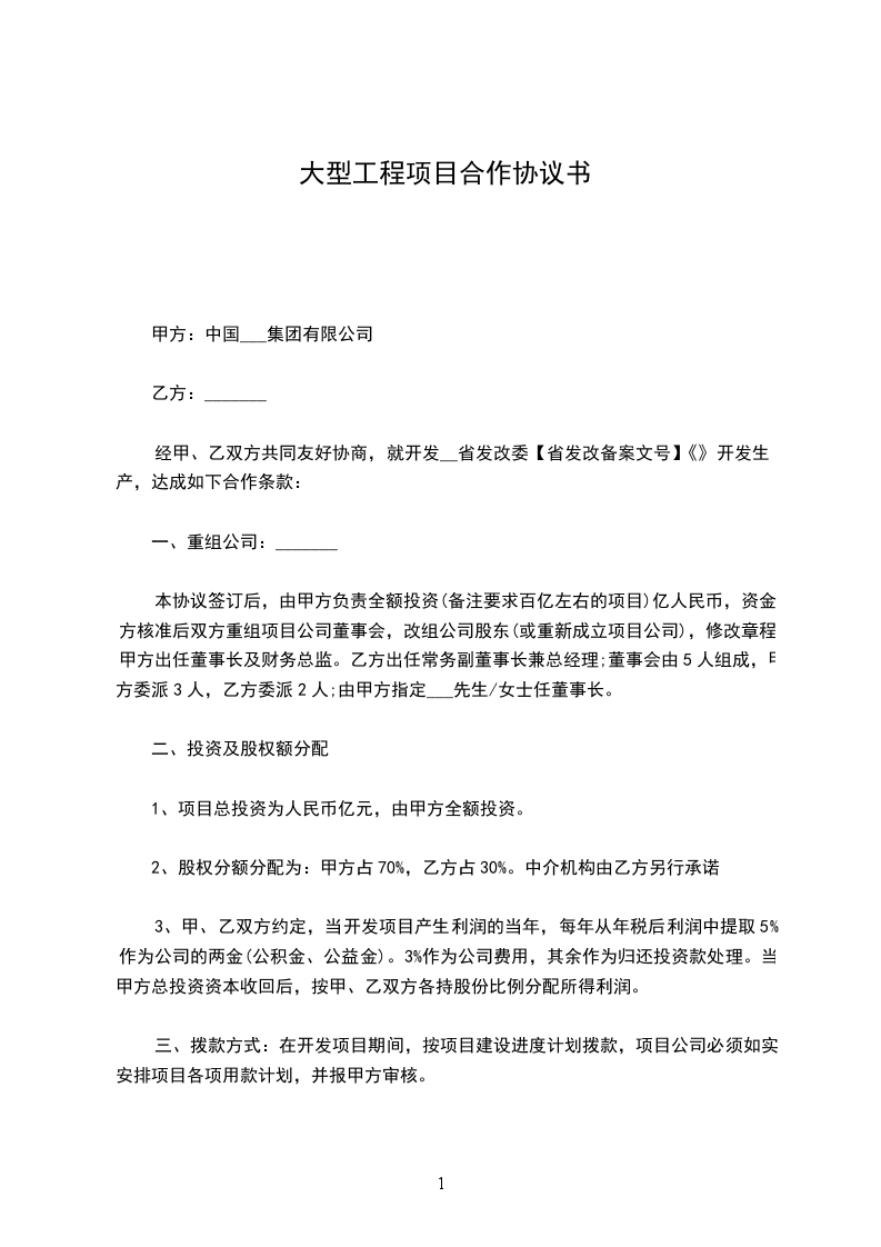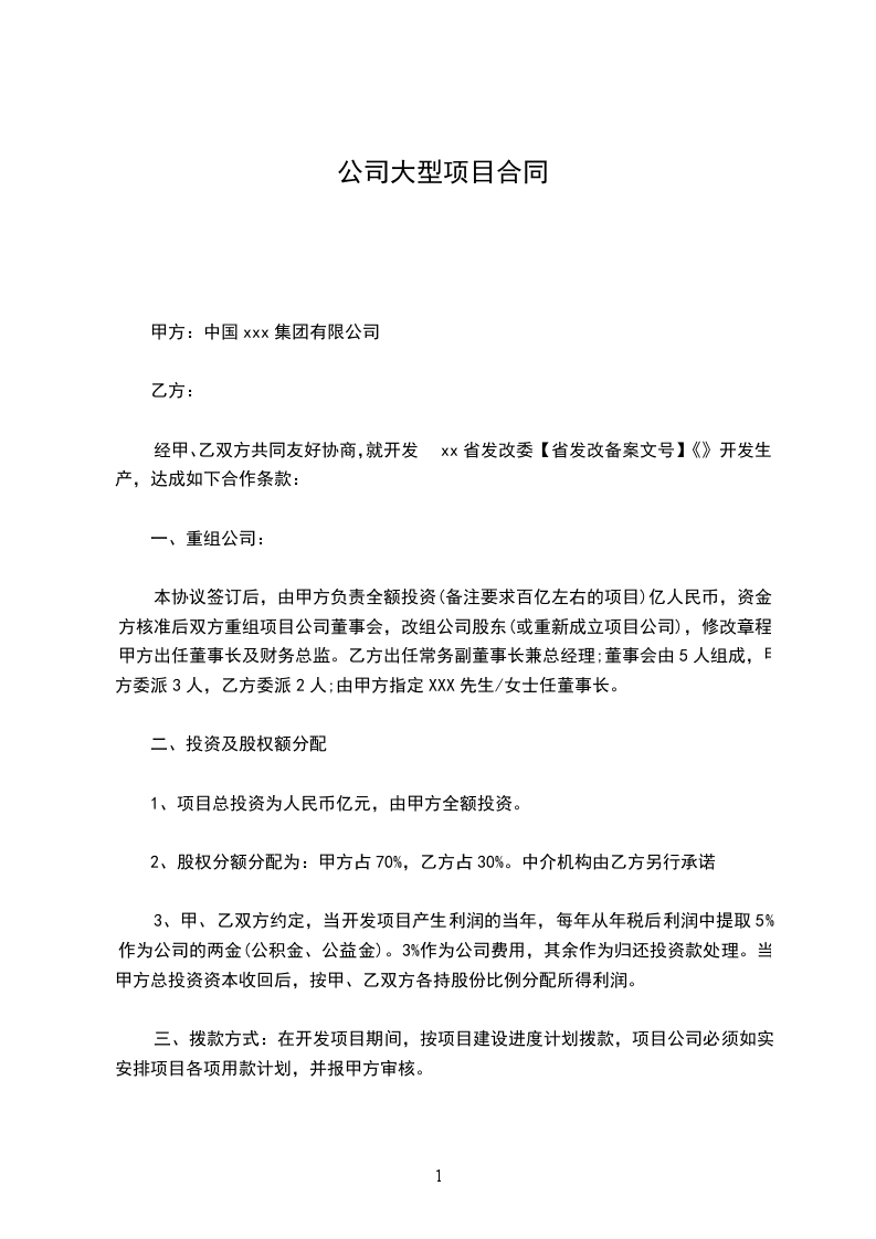 本协议签订后,由甲方负责全额投资(备注要求百亿左右的项目)亿人民币,资金方核准后双方重组项目公司董事会,改组公司股东(或重新成立项目公司),修改章程;甲方出任董事长及财务总监。乙方出任常务副董事长兼总经理;董事会由5人组成,甲方委派3人,乙方委派2人;由甲方指定XXX先生/女士任董事长。