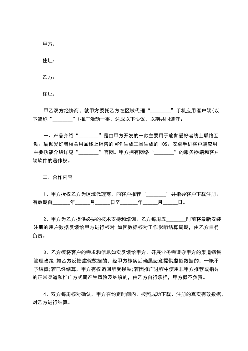 1、甲方授权乙方为区域代理商,向客户推荐“________”并指导客户下载注册。有效期自_______年______月______日至_______年______月______日。