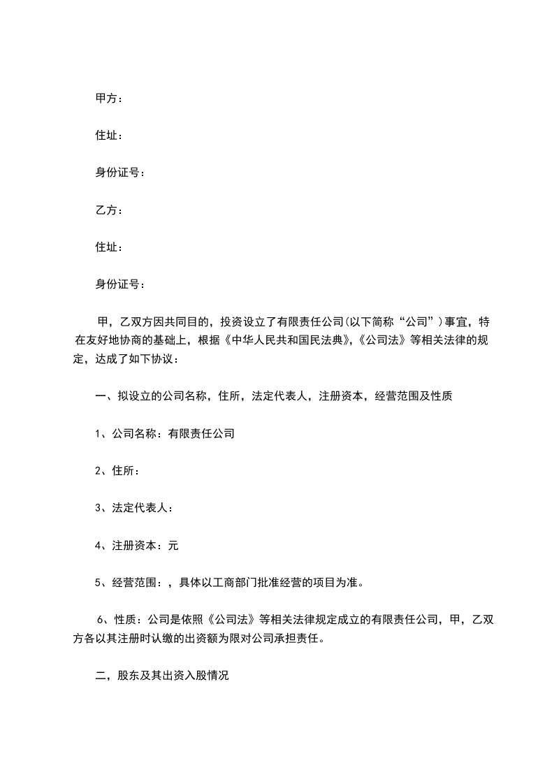 甲,乙双方因共同目的,投资设立了有限责任公司(以下简称“公司”)事宜,特在友好地协商的基础上,根据《中华人民共和国民法典》,《公司法》等相关法律的规定,达成了如下协议: