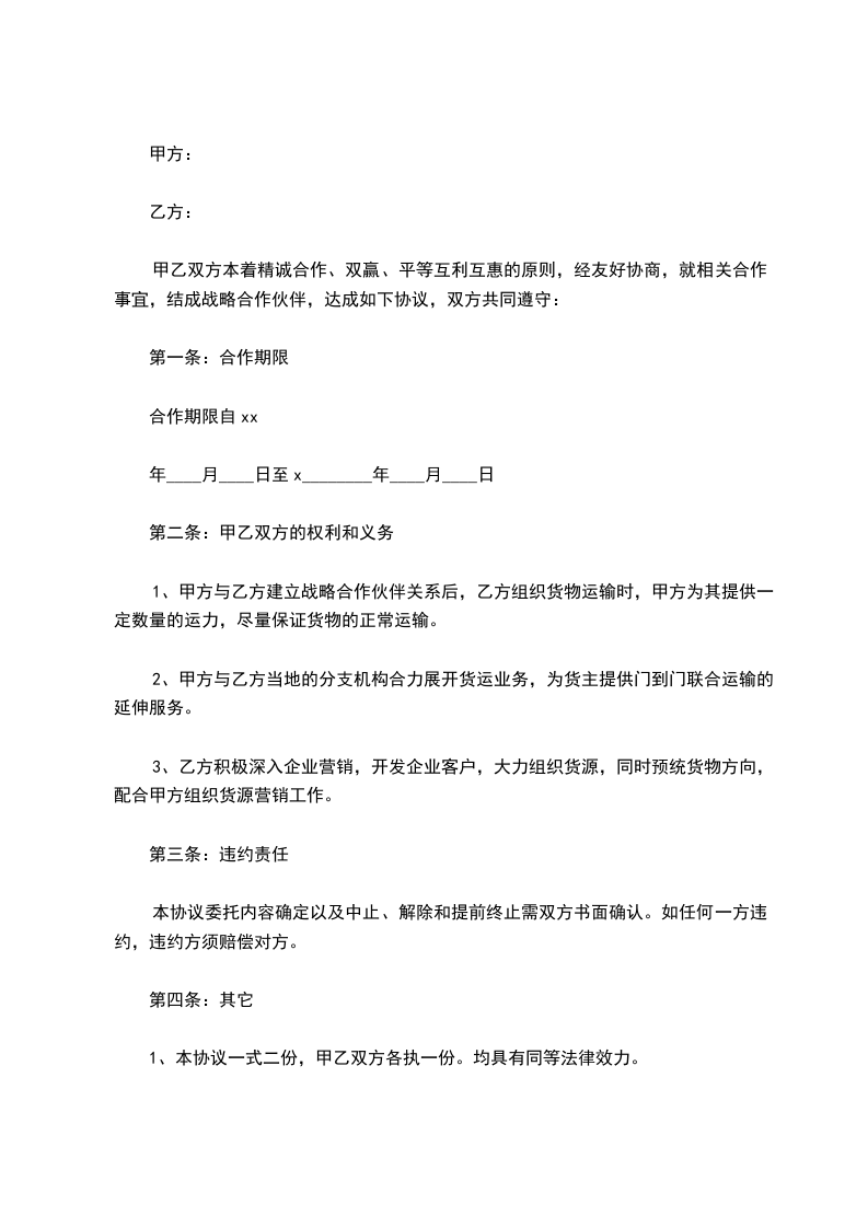 1、甲方与乙方建立战略合作伙伴关系后,乙方组织货物运输时,甲方为其提供一定数量的运力,尽量保证货物的正常运输。