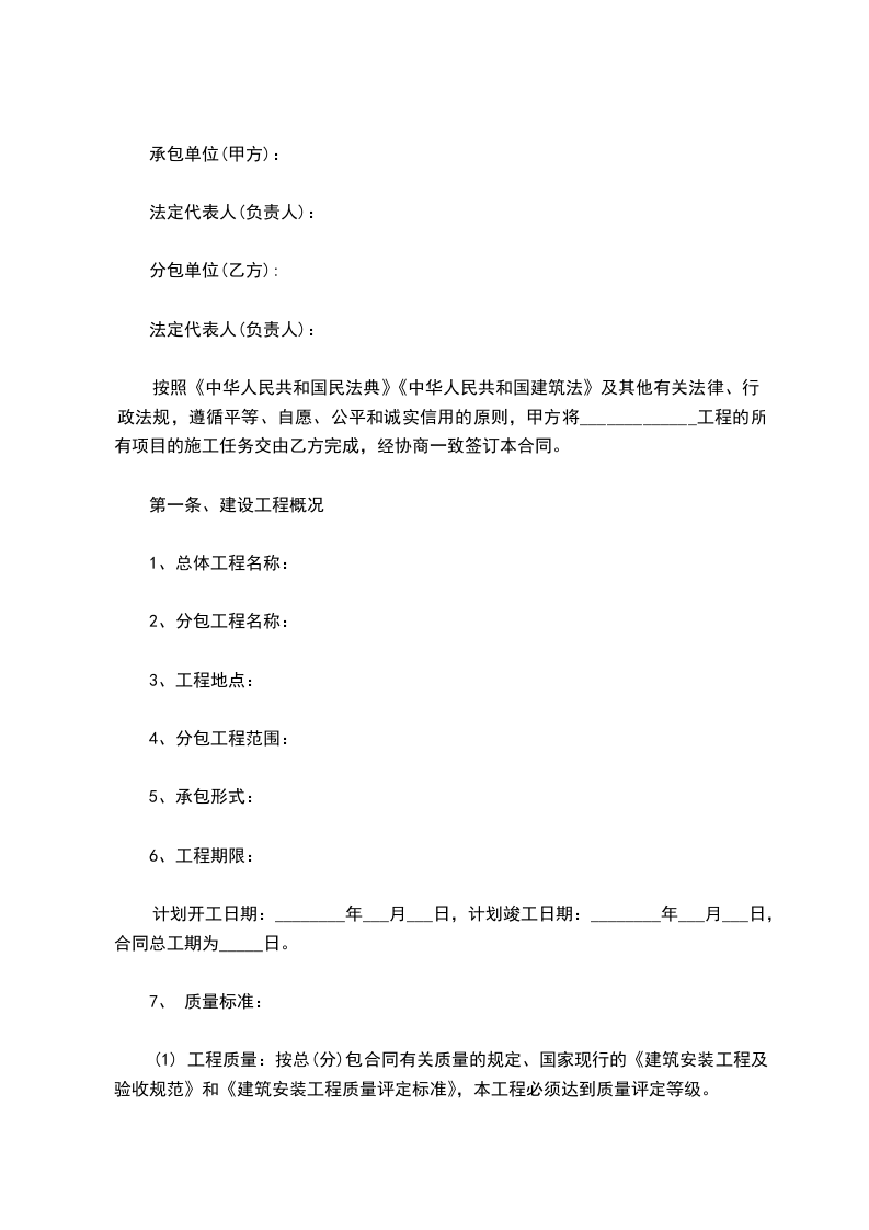 按照《中华人民共和国民法典》《中华人民共和国建筑法》及其他有关法律、行政法规,遵循平等、自愿、公平和诚实信用的原则,甲方将_____________工程的所有项目的施工任务交由乙方完成,经协商一致签订本合同。