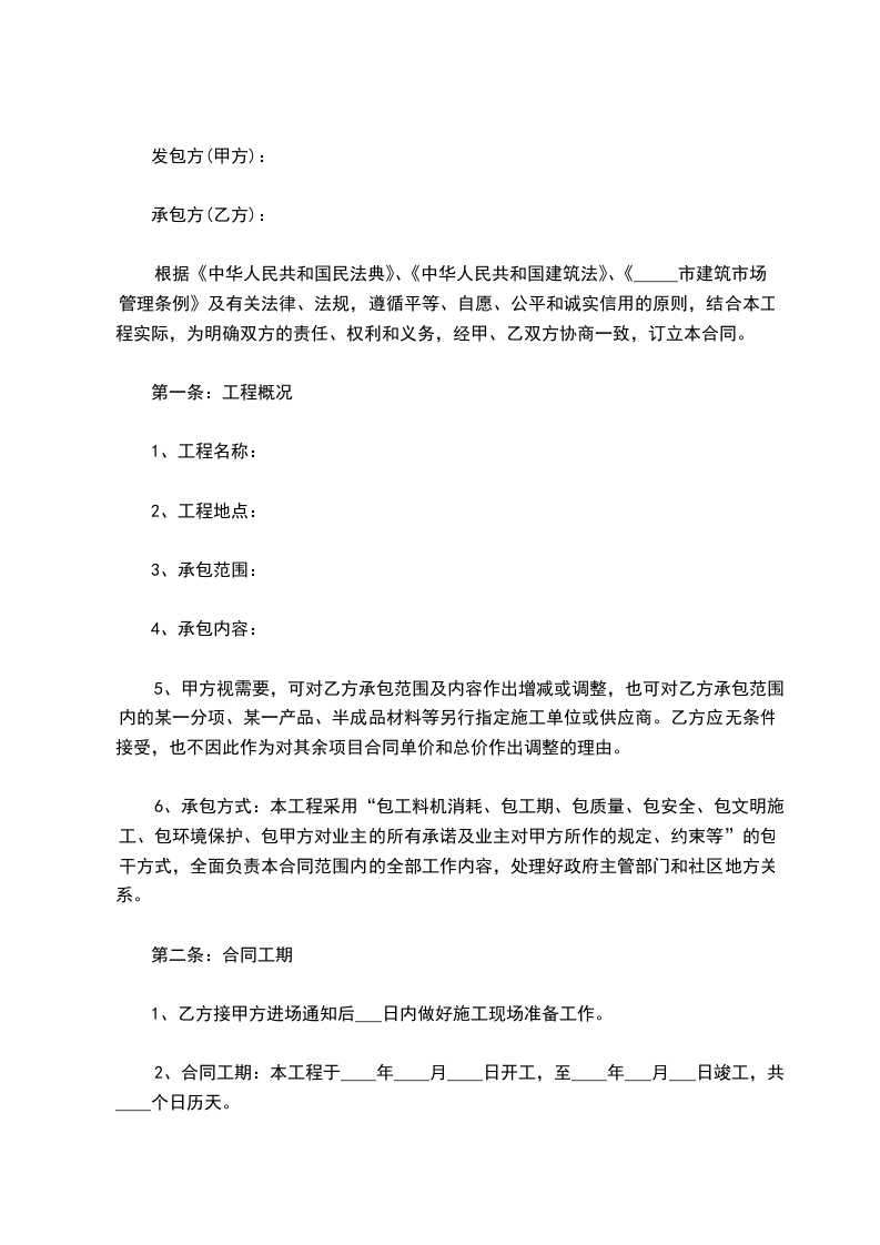 6、承包方式:本工程采用“包工料机消耗、包工期、包质量、包安全、包文明施工、包环境保护、包甲方对业主的所有承诺及业主对甲方所作的规定、约束等”的包干方式,全面负责本合同范围内的全部工作内容,处理好政府主管部门和社区地方关系。