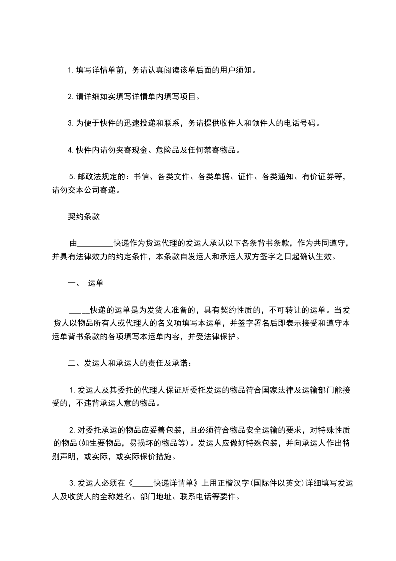 _____快递的运单是为发货人准备的,具有契约性质的,不可转让的运单。当发货人以物品所有人或代理人的名义项填写本运单,并签字署名后即表示接受和遵守本运单背书条款的各项填写本运单内容,并受法律保护。