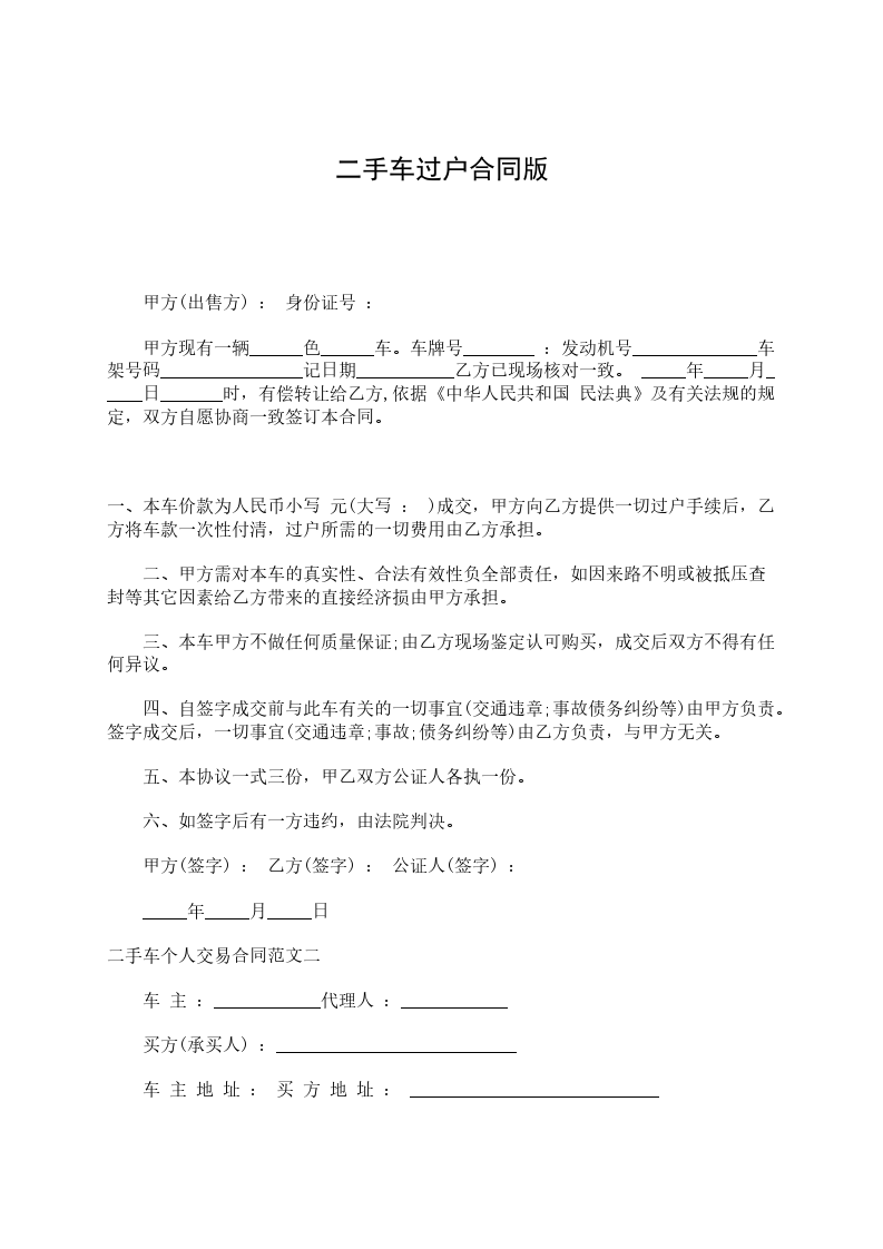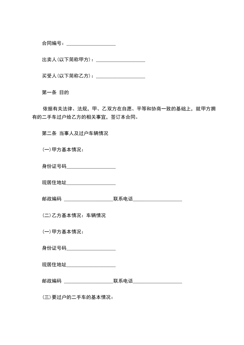 依据有关法律、法规,甲、乙双方在自愿、平等和协商一致的基础上,就甲方拥有的二手车过户给乙方的相关事宜,签订本合同。