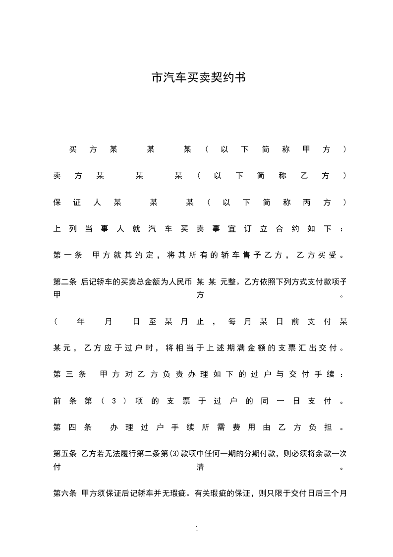 第一条 甲方就其约定,将其所有的轿车售予乙方,乙方买受。