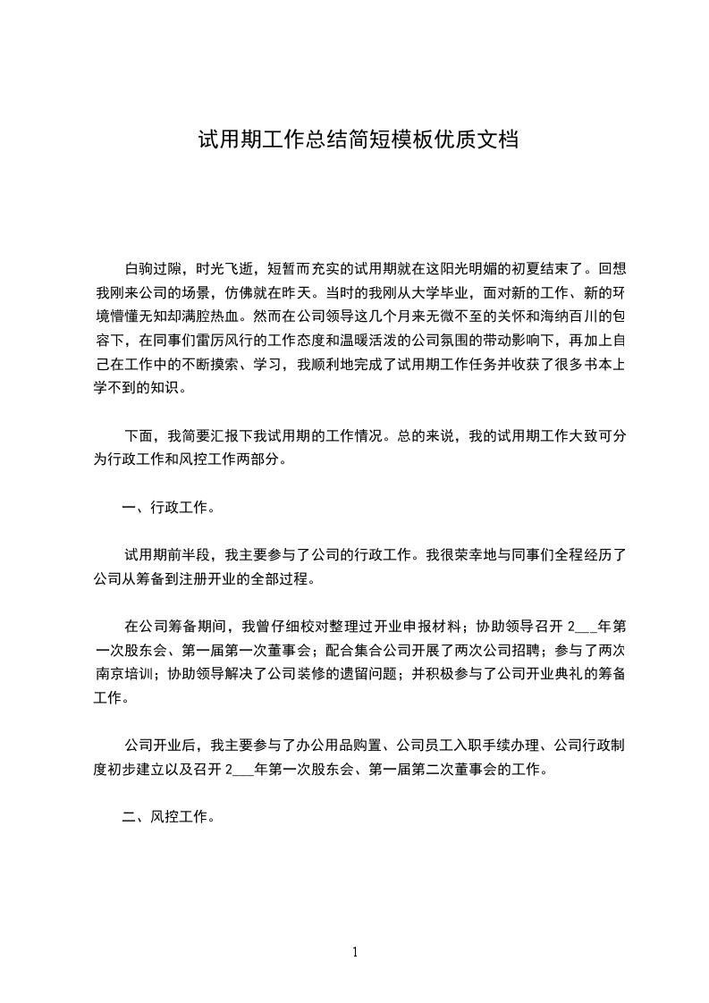 下面,我简要汇报下我试用期的工作情况。总的来说,我的试用期工作大致可分为行政工作和风控工作两部分。