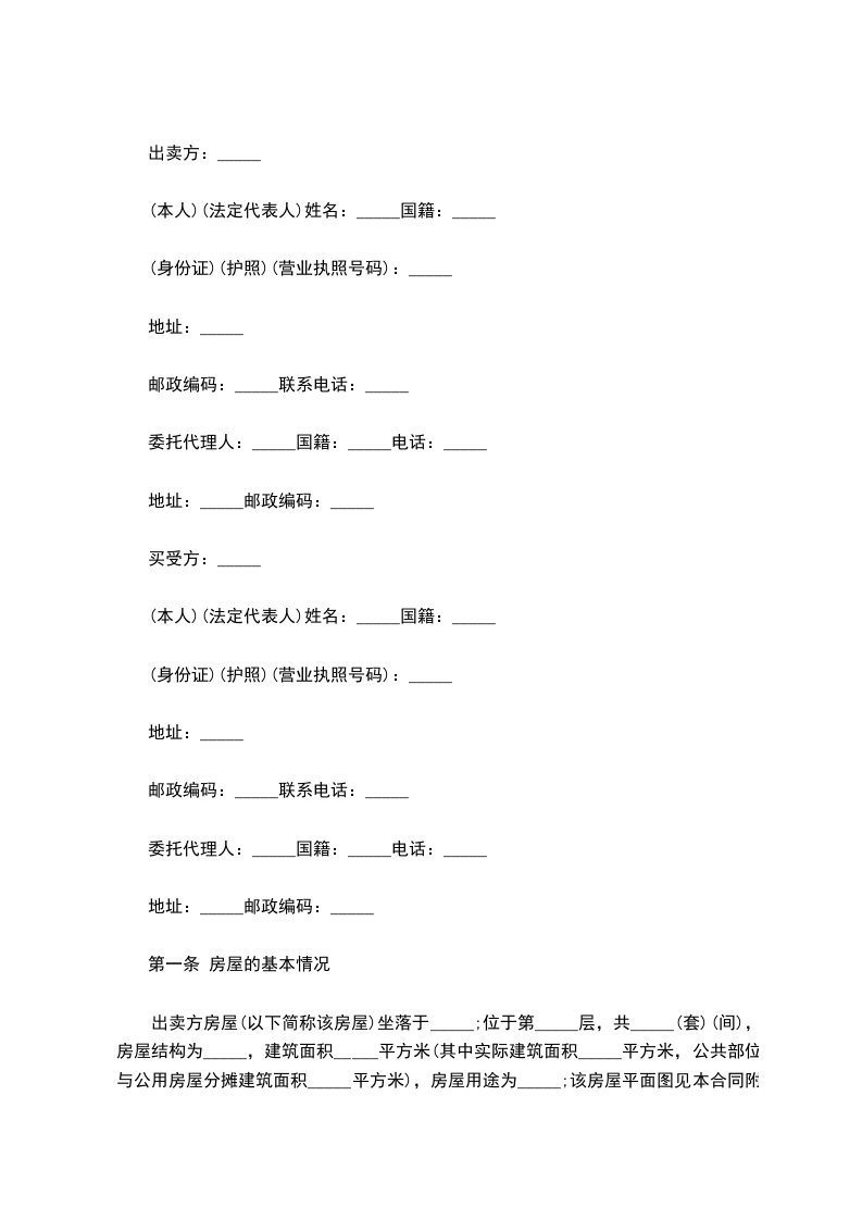 房屋买卖合同协议 出卖方:_____ (本人)(法定代表人)姓名:_____国籍:_____ (身份证)(护照)(营业执照号码):_____